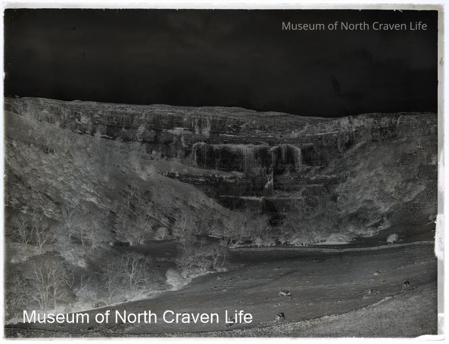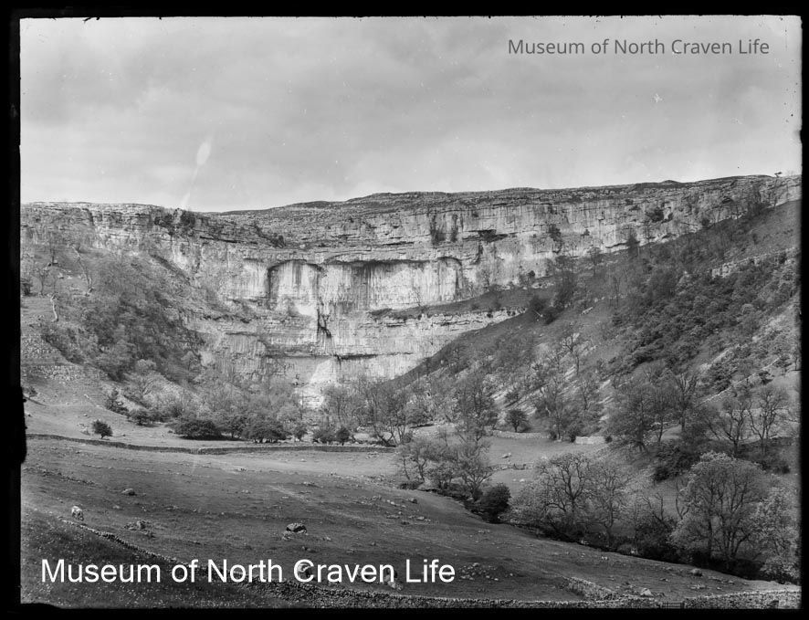 A full-plate gelatin silver glass negative. View of Malham Cove from neighbouring fields, with limestone cliffs and grazing sheepCollection