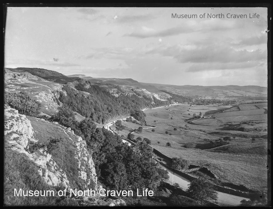 A full-plate gelatin silver glass negative. View of Giggleswick Scar, wooded slopes, road and open farmlandCollection