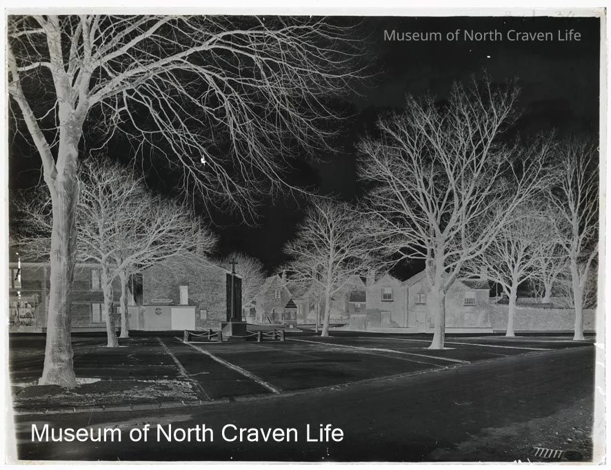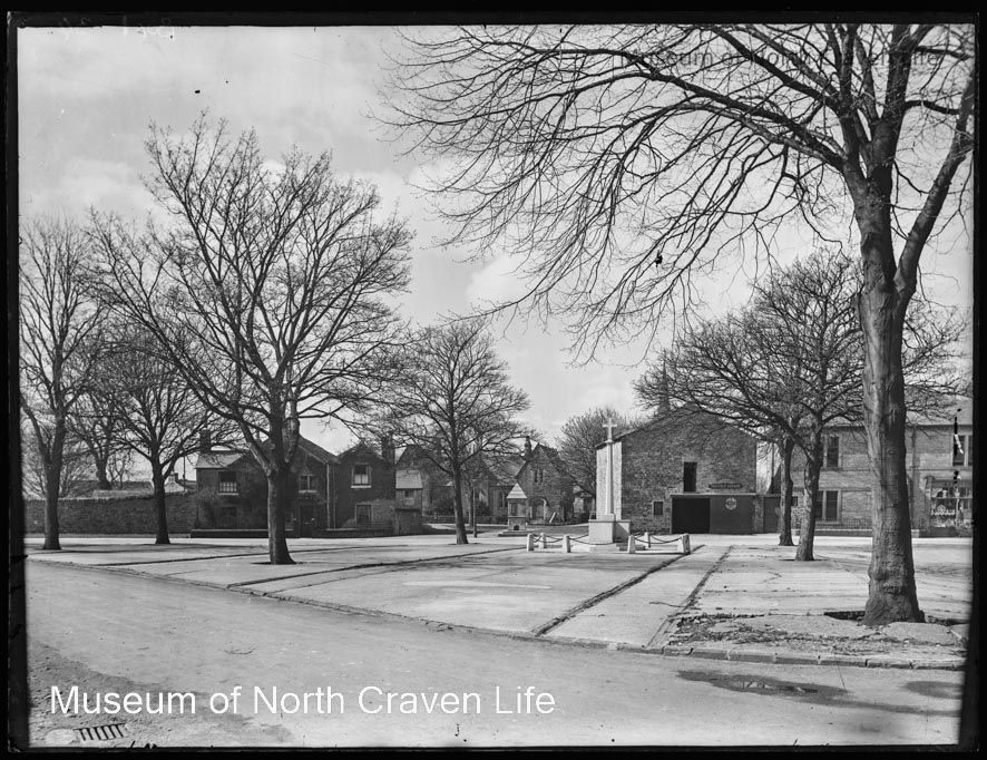 A full-plate gelatin silver glass negative. Long Preston, paved green with winter trees and monument with cross.Collection