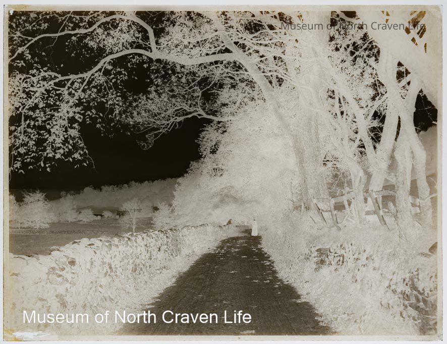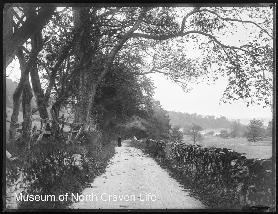 A full-plate gelatin silver glass negative. View north along Stackhouse Lane; mature trees to left; women in late Victorian/Edwardian dress in middle distanceCollection