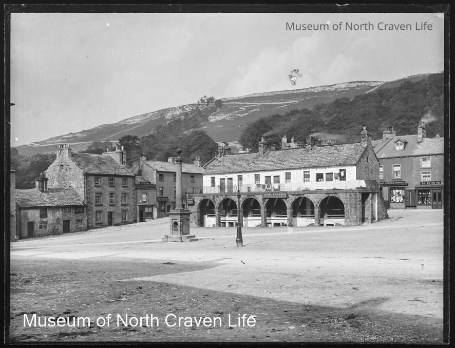 A full-plate gelatin silver glass negative. Settle Market Square. View across square and cross. Shambles with one storey above. Shops include Chadwick tailors and Rowlandson 'Tinner and Brazier'. Two children at foot of cross.Collection