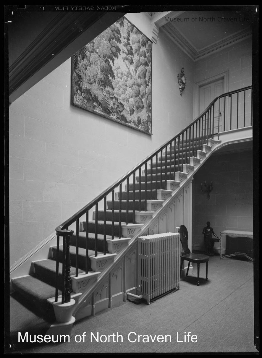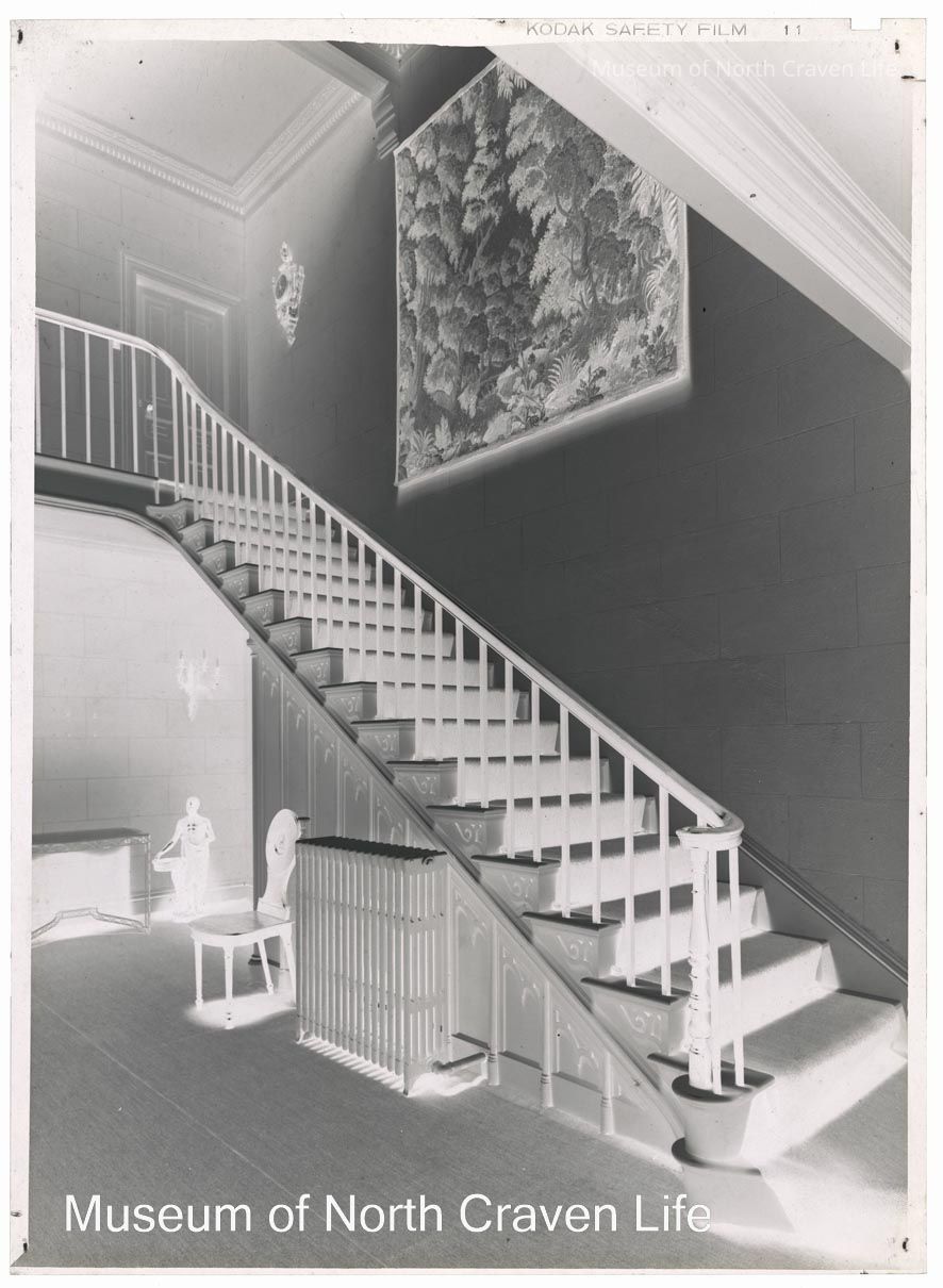 A gelatin silver acetate film negative. A view of the Eshton Estate - House interior : staircase with wall hanging and clockCollection