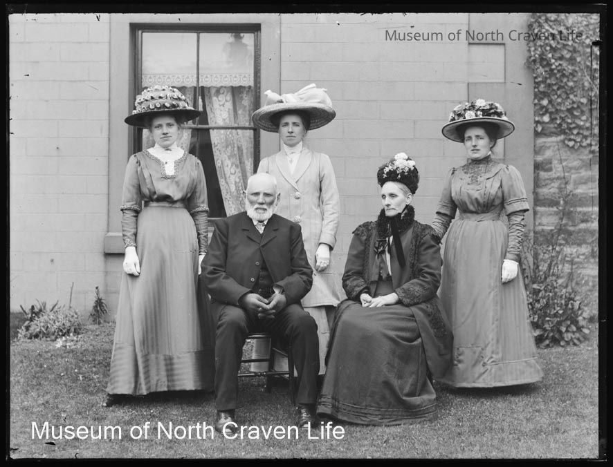A full-plate gelatin silver glass negative. Group portrait. Four women (one seated) and a bearded, balding man (seated)Collection