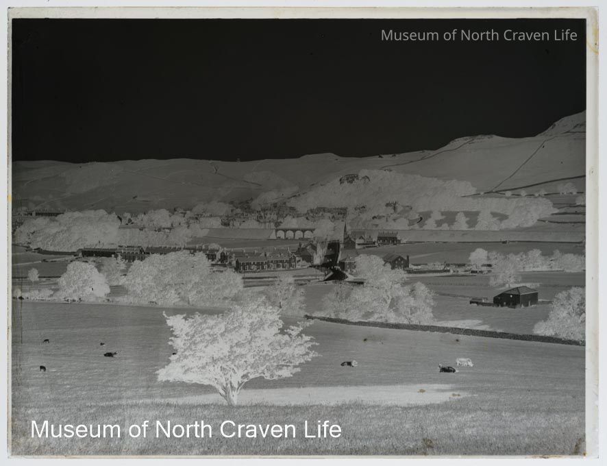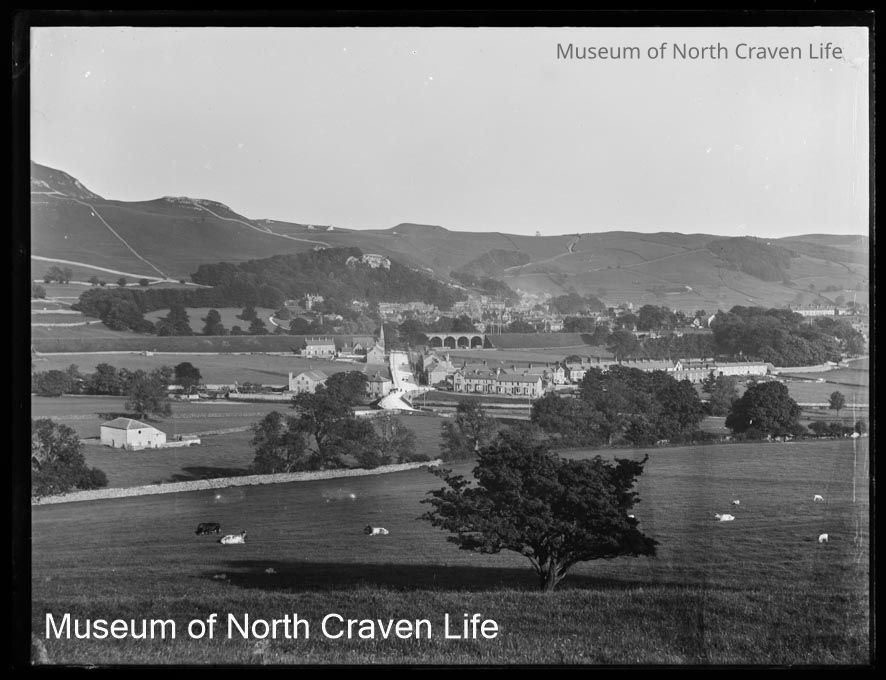 A full-plate gelatin silver glass negative. View of Settle from High School, with fields to foreground and hills beyond.Collection