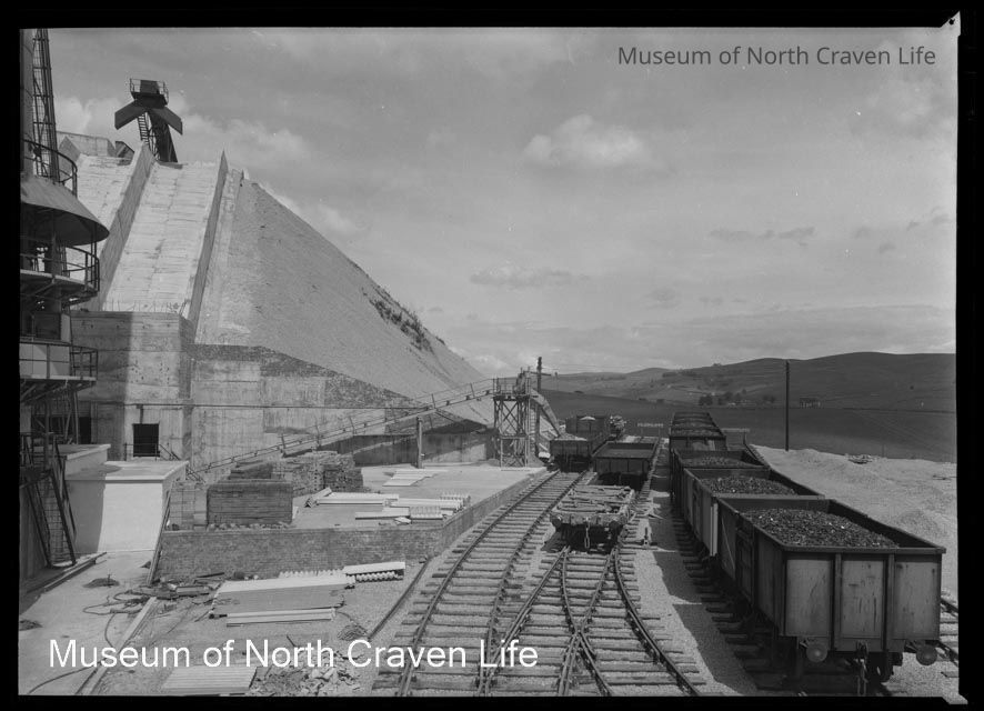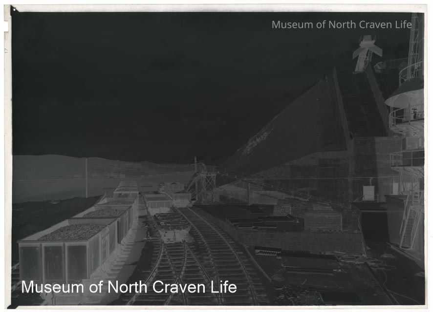 A gelatin silver acetate film negative. A view of the gas-fired kiln with railway track at Settle Limes. July 1954Collection
