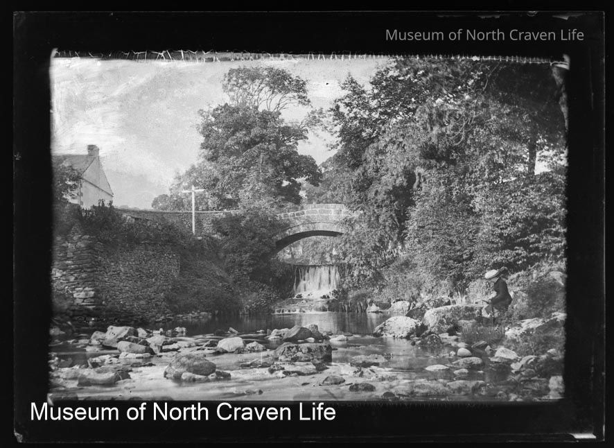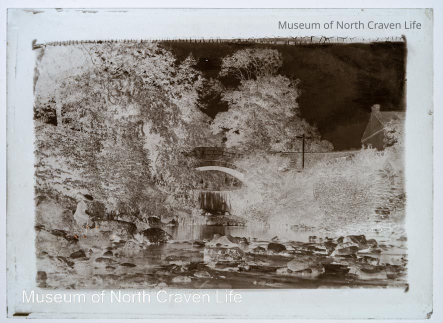 A half-plate gelatin silver glass negative. A view of Clapham Beck from below the bridge at Clapham which frames the falls. A house and a fingerpost sign appear on the left. Trees rise up behind and to the right of the bridge. Rocks and stones appear in the foregroundCollection