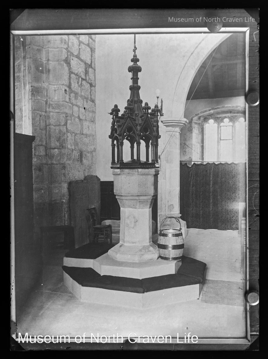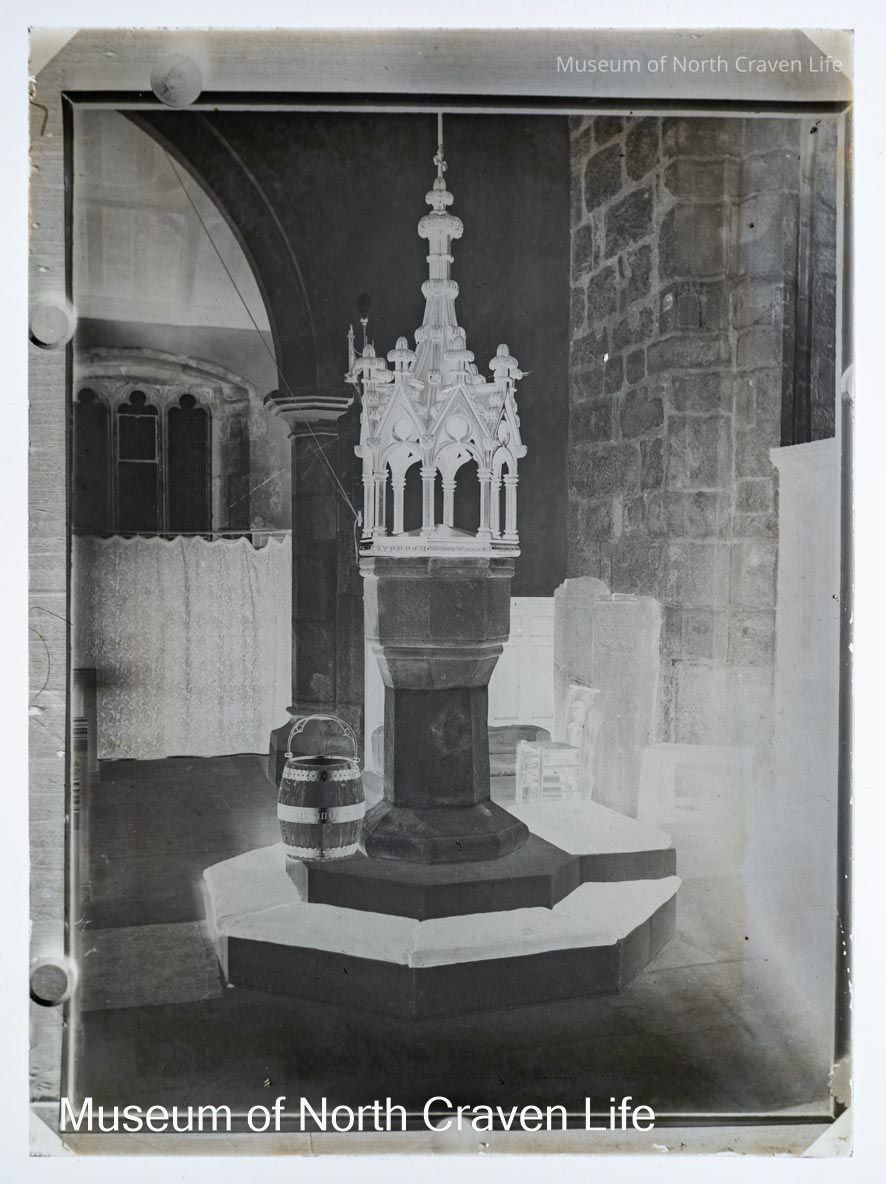 A half-plate gelatin silver glass negative. A view of the font in St. Alkelda's, Giggleswick from the front. Cushions line the bottom step at the base. A small decorative wine barrel stands on the second step of the monumentCollection