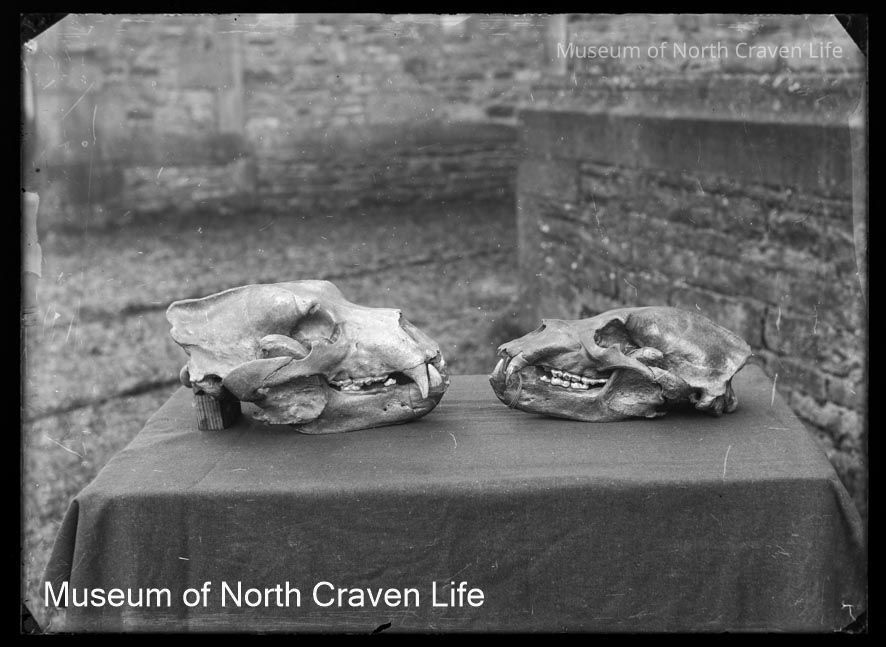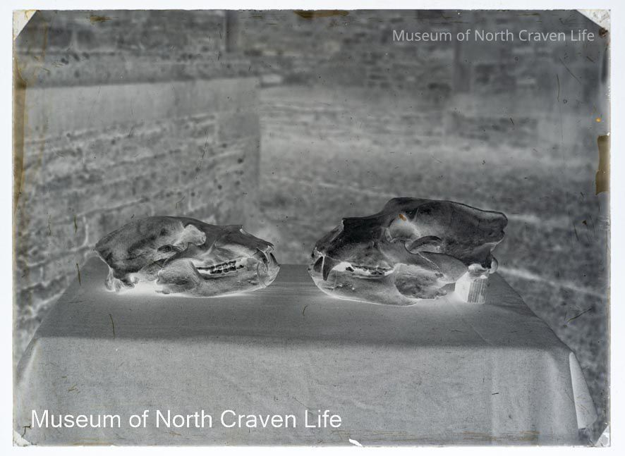 A half-plate gelatin silver glass negative. A pair of bear skulls recovered from Victoria Cave, displayed outdoors on a cloth-covered table. Photographed in profile viewCollection