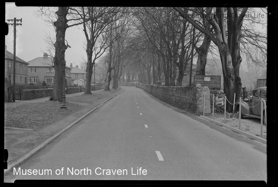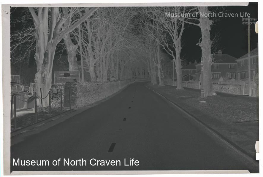 A gelatin silver acetate film negative. A view of tree-lined Falcon Road in Settle (Skipton Road). A car is parked on the right behind a chain railingCollection