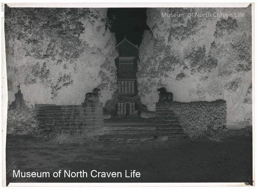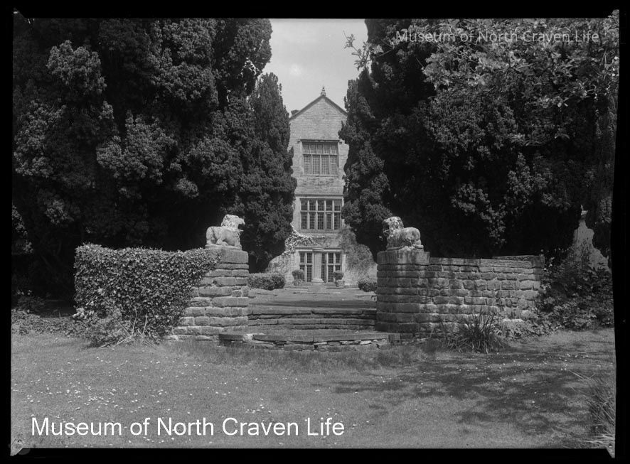 A gelatin silver acetate film negative. A view of Lawkland Hall in the Parish of Austwick. Seen from the lawns looking toward the terrace up a flight of steps flanked by two stone lion ornamentsCollection