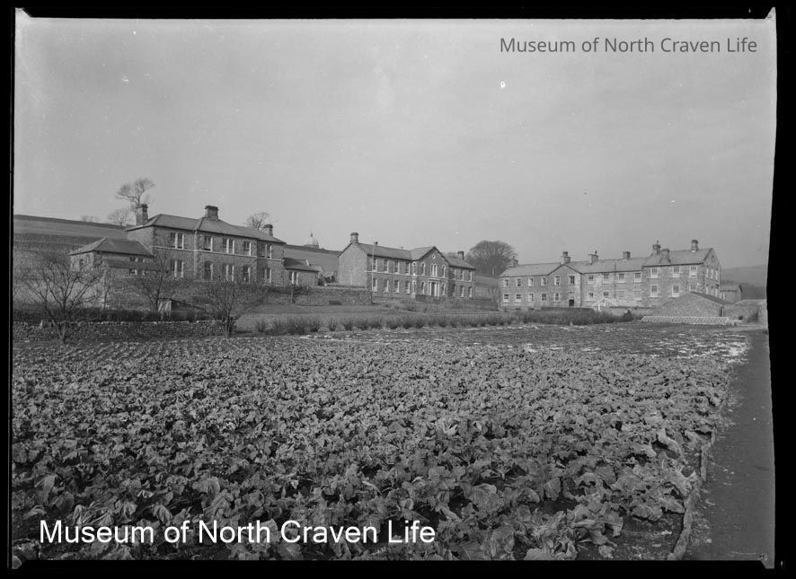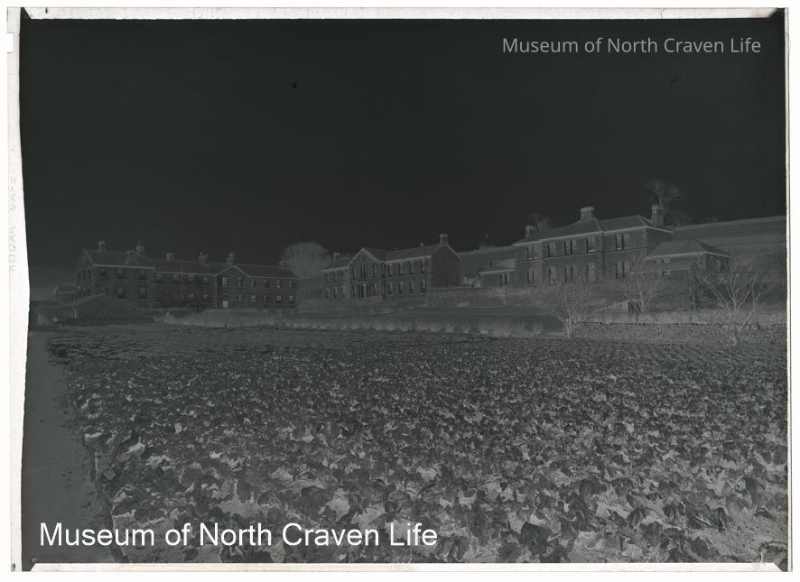 A gelatin silver acetate film negative. A view across a cabbage field towards buildings of Castleberg Hospital, as viewed from Raines Road.The dome of Giggleswick School Chapel is visible above the crest of the hill between the two detached buildings.Collection