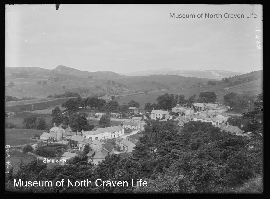 An aerial view of Stainforth with hills in the background and trees in the foregroundCollection