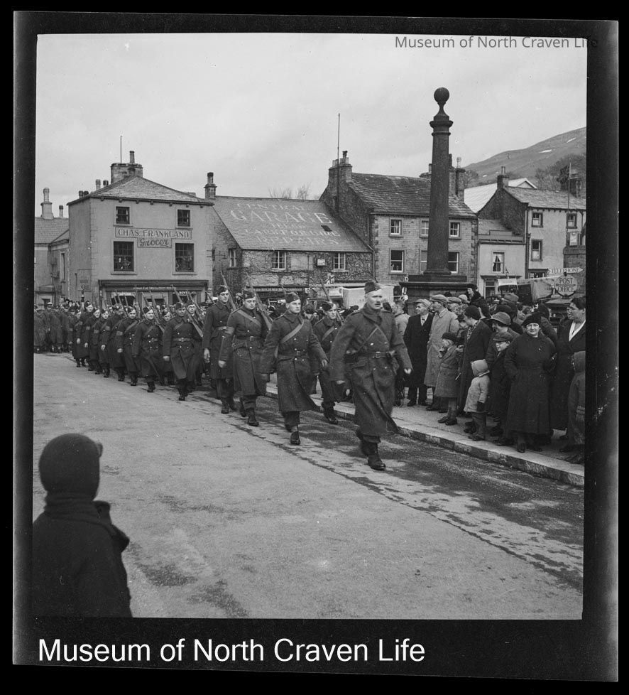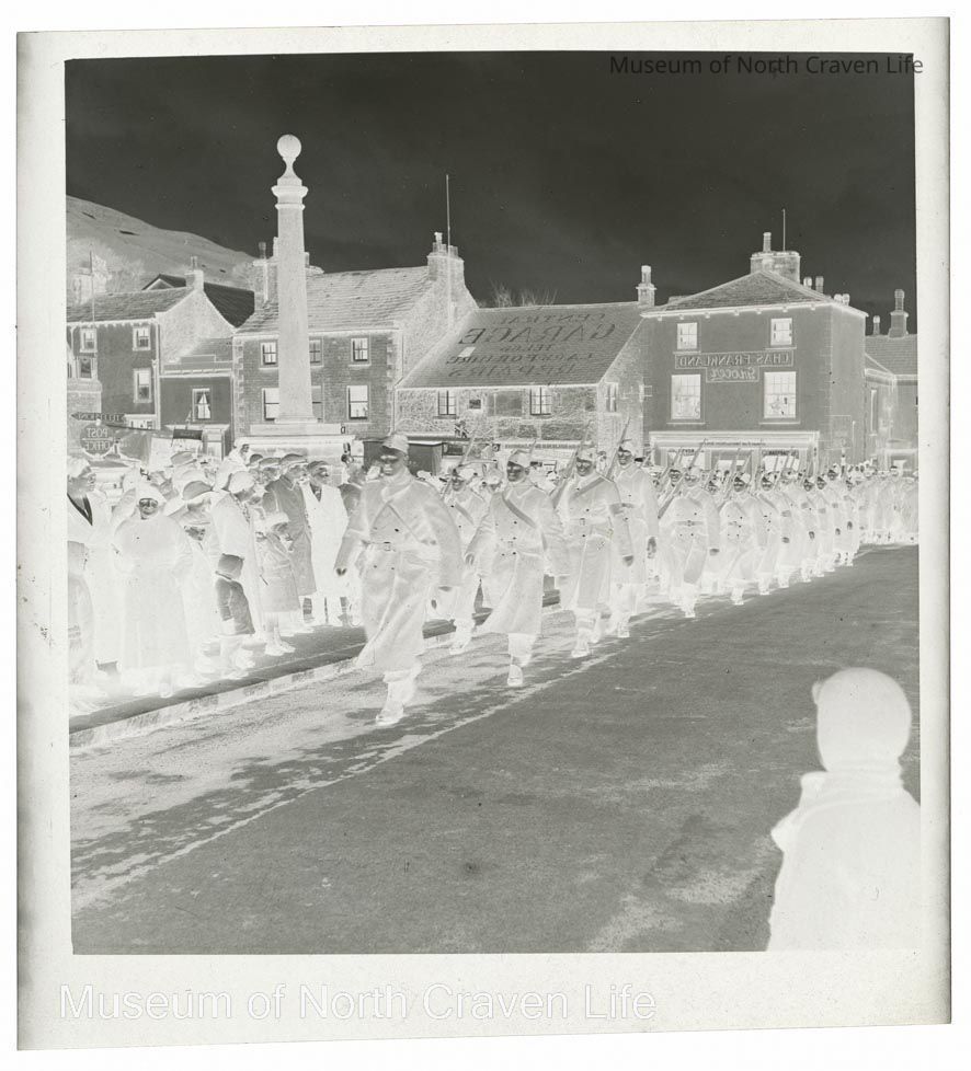 A 2 ½ x 2 ½" b/w acetate film negative. A view of a Home Guard Parade 1945 in Settle Market Square. A number of commercial premises are visible : Chas Frankland (Grocer) ; Central GarageCollection