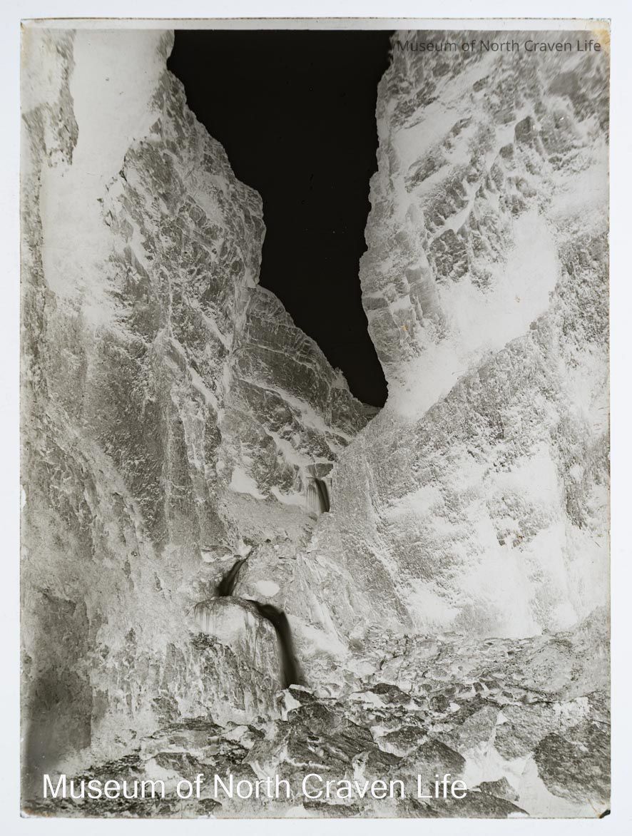 A half-plate gelatin silver glass negative. View of Gordale Scar from bottom, with limestone cliffs and waterfalls.Collection