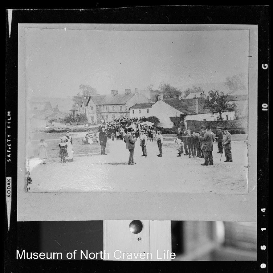 A 2 ½ x 2 ½" b/w acetate film negative. A view of a road race in the centre of Malham. Three men are lined up before a tape on starter's orders. A large group of people stand behind on the bridgeCollection