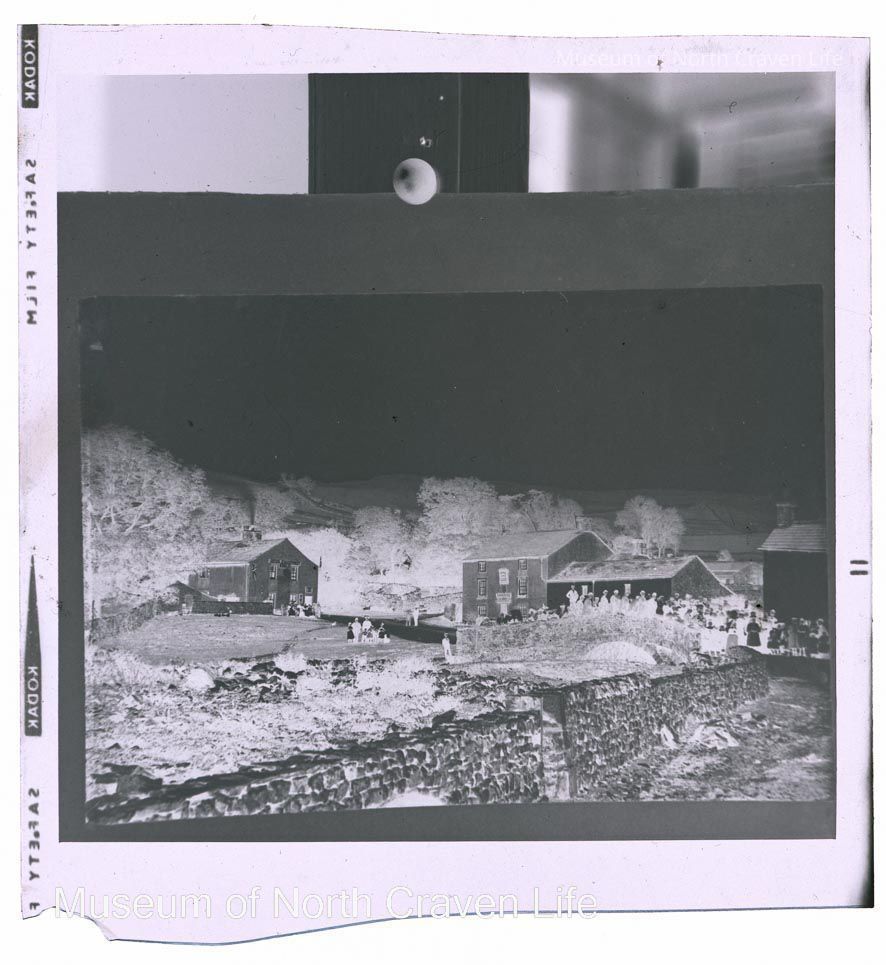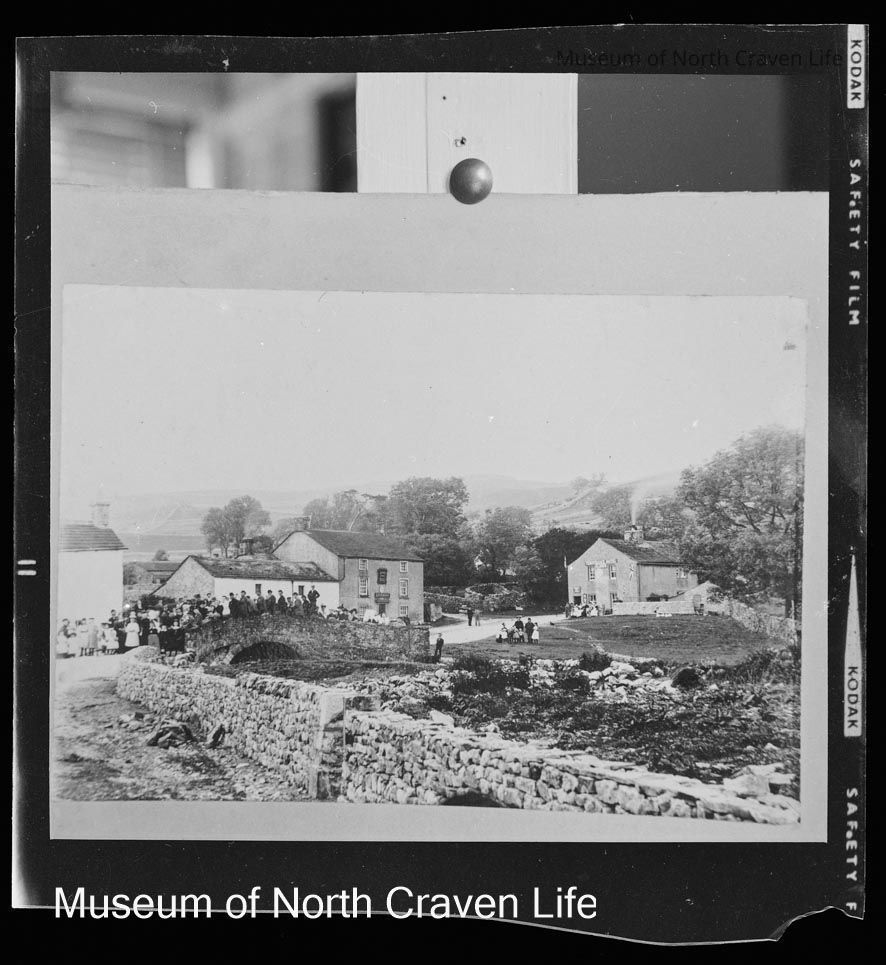 A 2 ½ x 2 ½" b/w acetate film negative. A view of the bridge in Malham with a large crowd assembled on it. Behind it stands Swinbank and to the right the Temperance Hotel'Collection