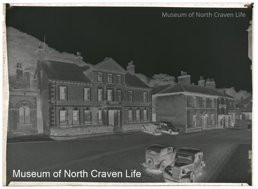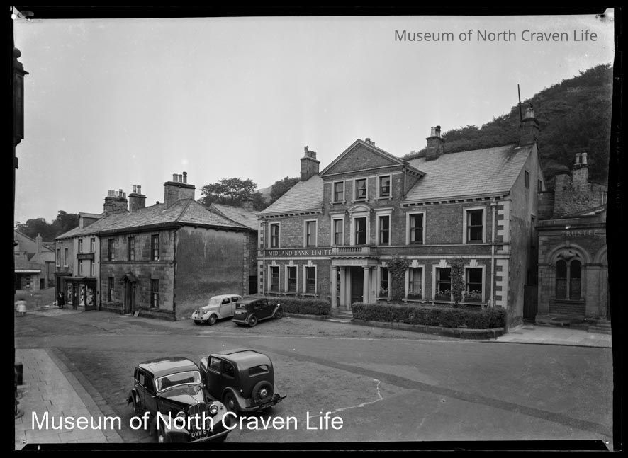 An acetate film negative. A view of the Midland Bank building in Settle Market Place (now part of HSBC Holdings plc). Four cars appear in the photograph, one with the registration "DWW 674" which was in use in the period 1904-1936Collection