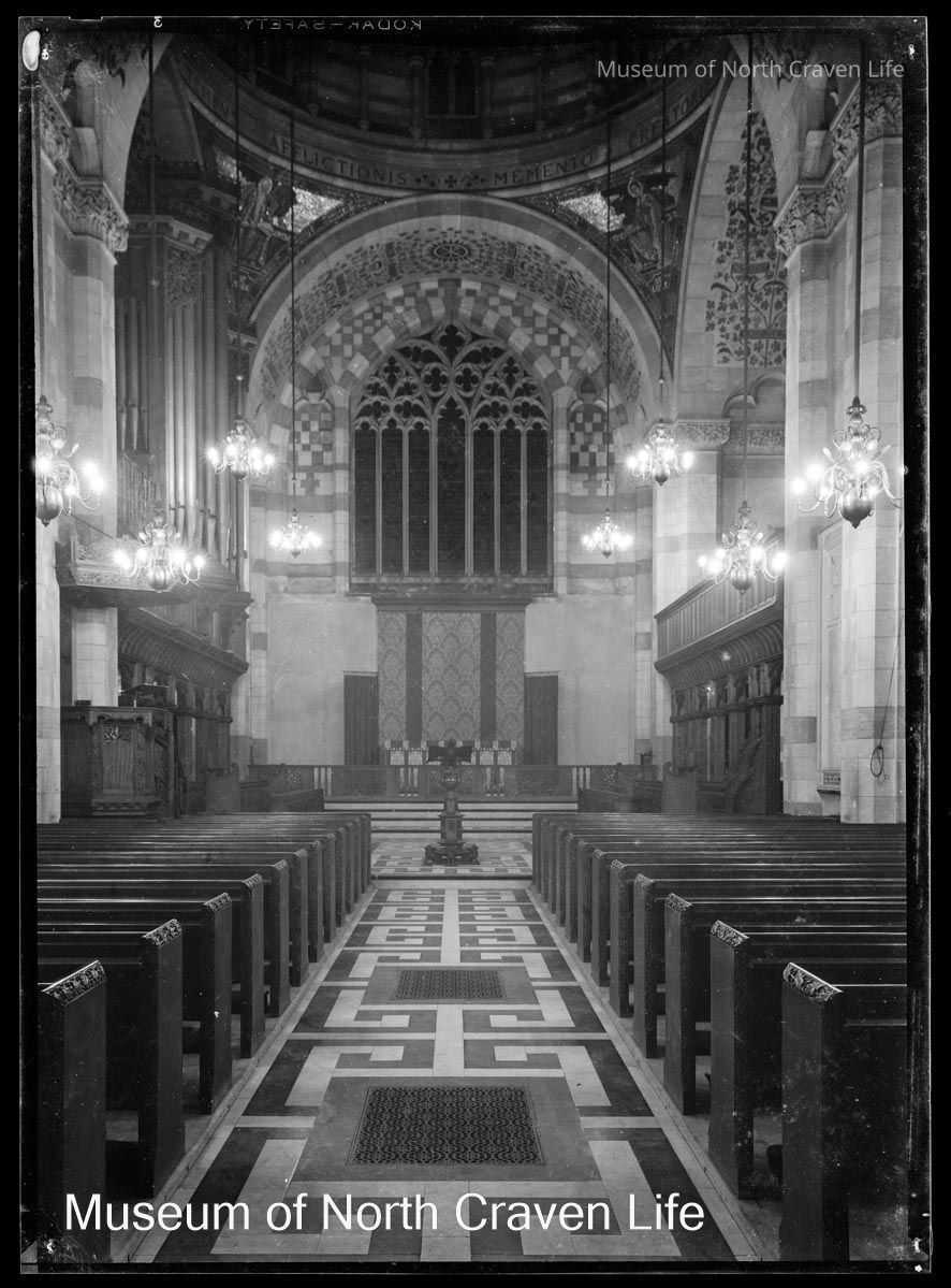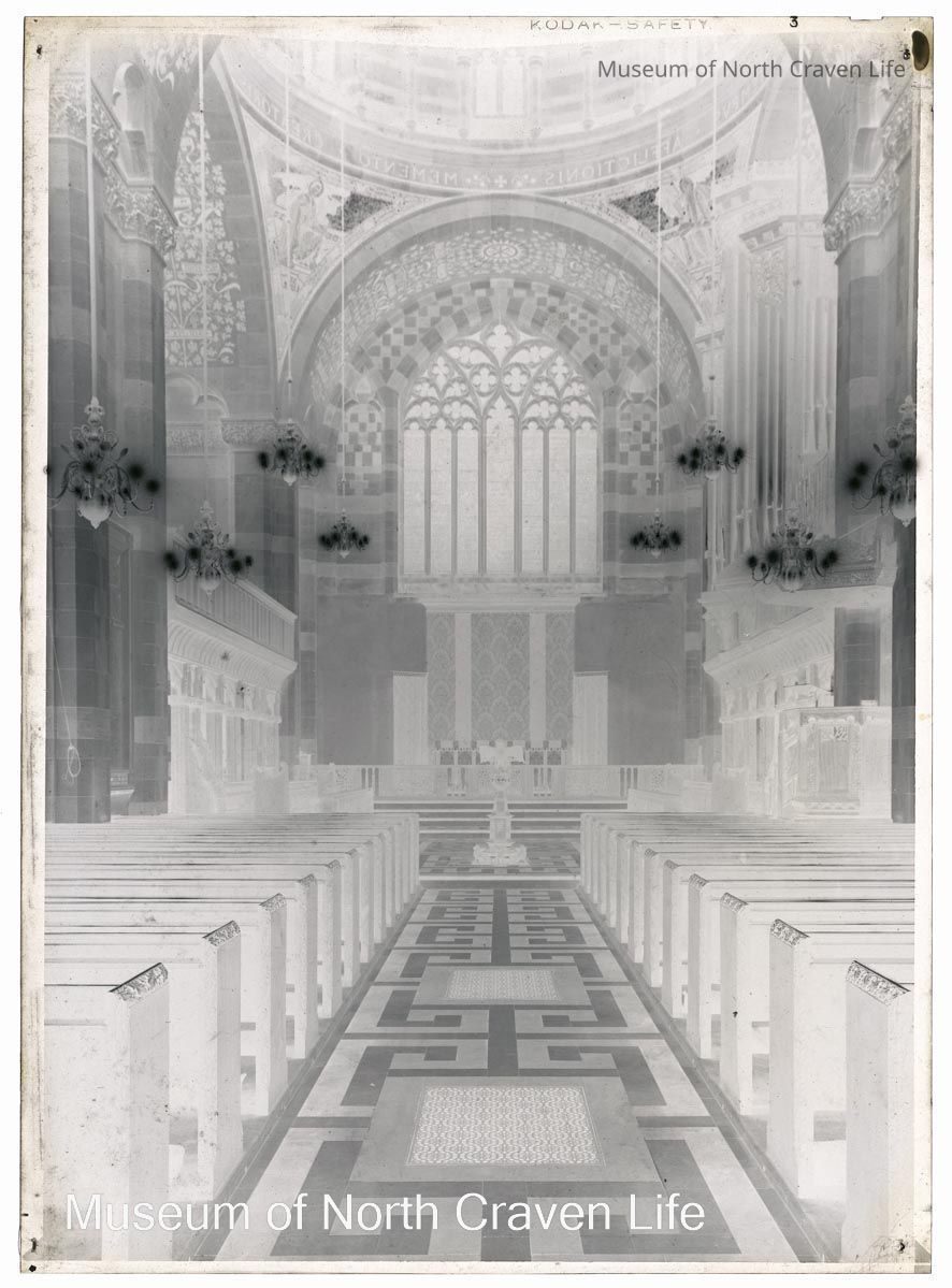 An acetate film negative. A view of the interior of Giggleswick School Chapel, looking down the central aisle. Eight suspended chandeliers have been illuminated in the central aisleCollection