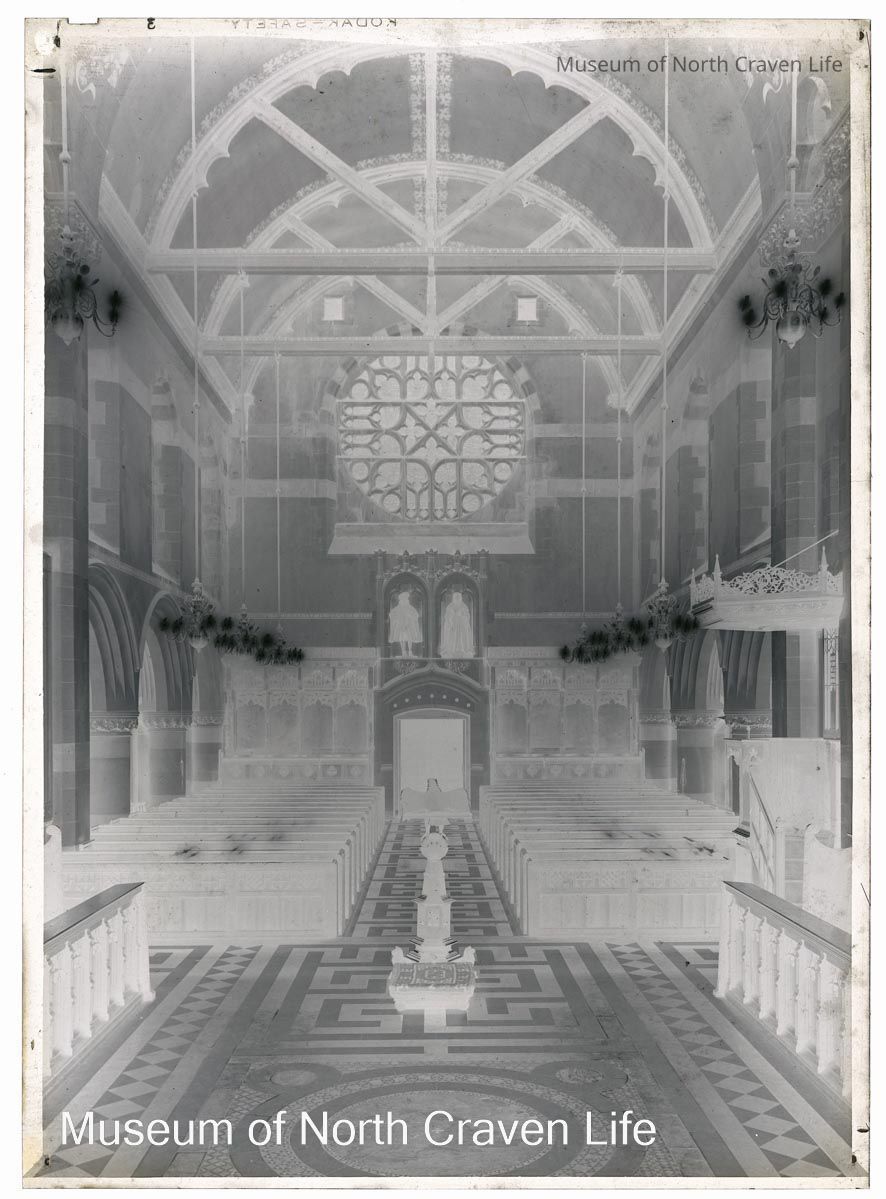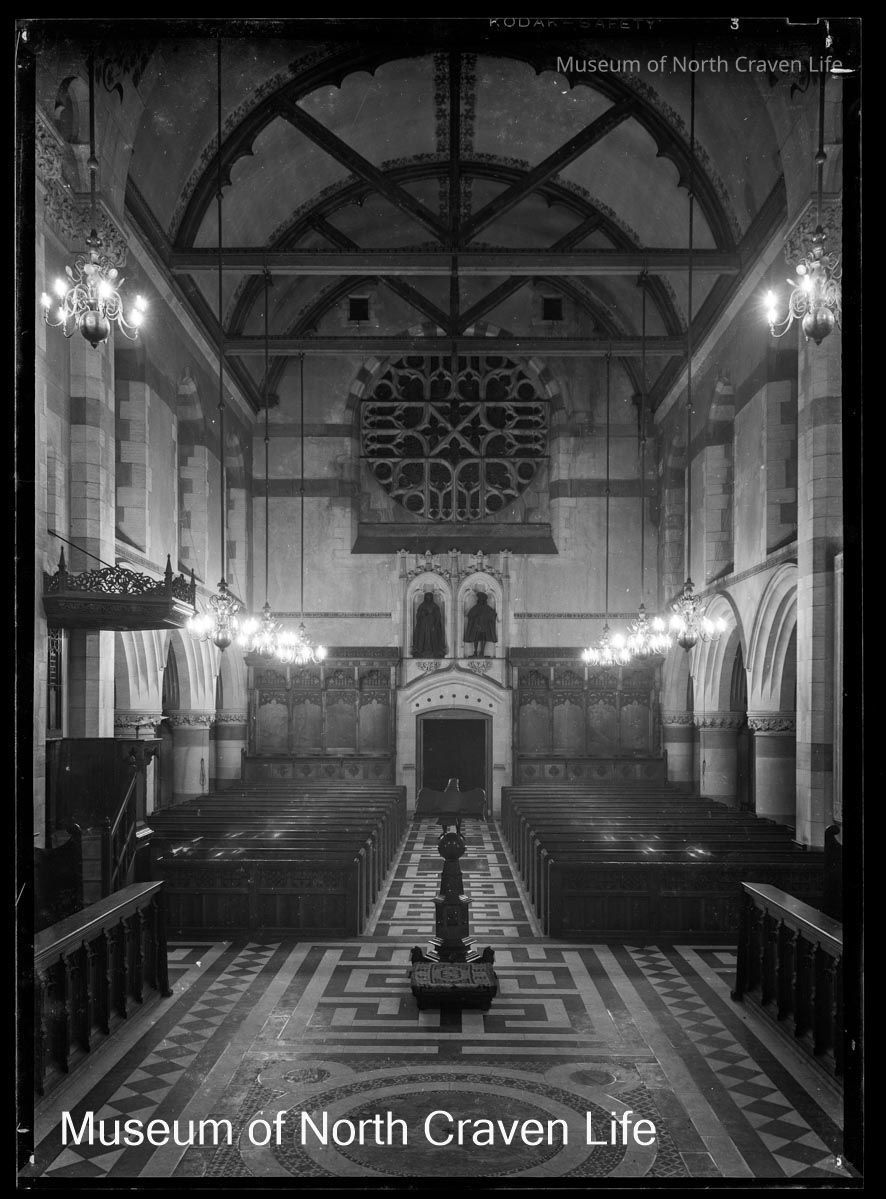 An acetate film negative. A view of the interior of Giggleswick School Chapel, looking down an aisle towards the bronze statutes of Edward VI and Queen Victoria by G Frampton in niches above the nave entrance. Ten suspended chandeliers have been illuminated in the aisleCollection