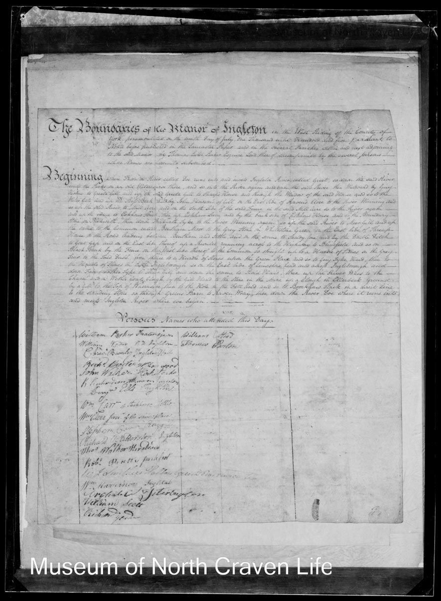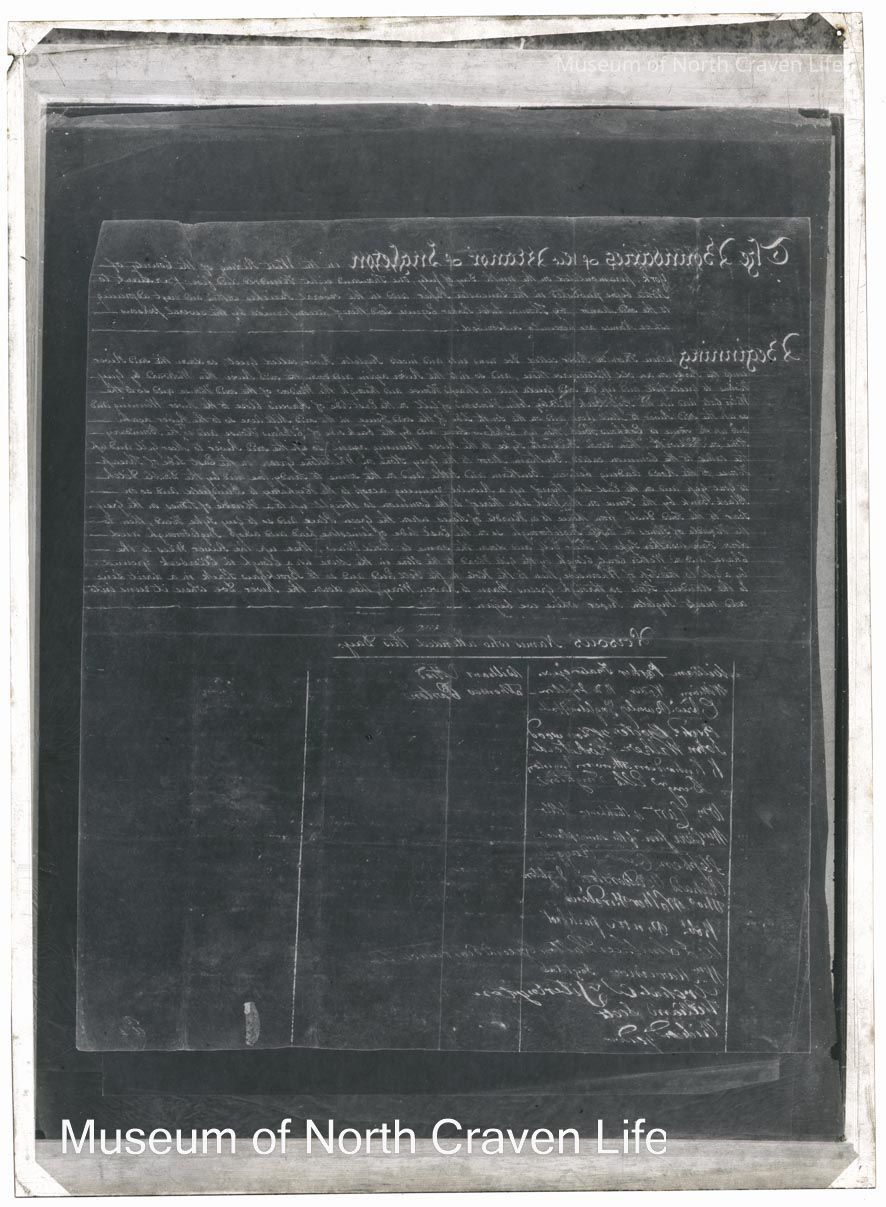 A nitrate film negative. A view of a copy of a framed written account of a perambulation of the boundaries of the Manor of Ingleton in 1805.Collection