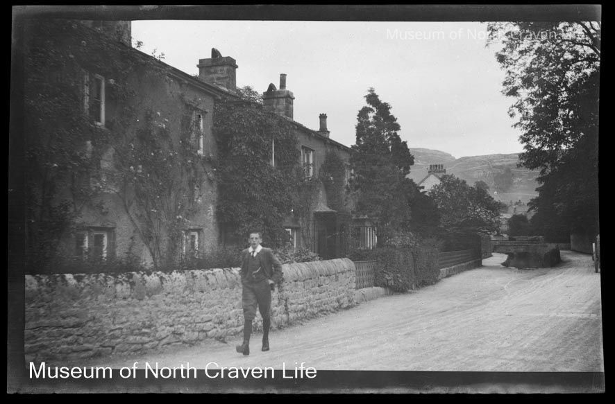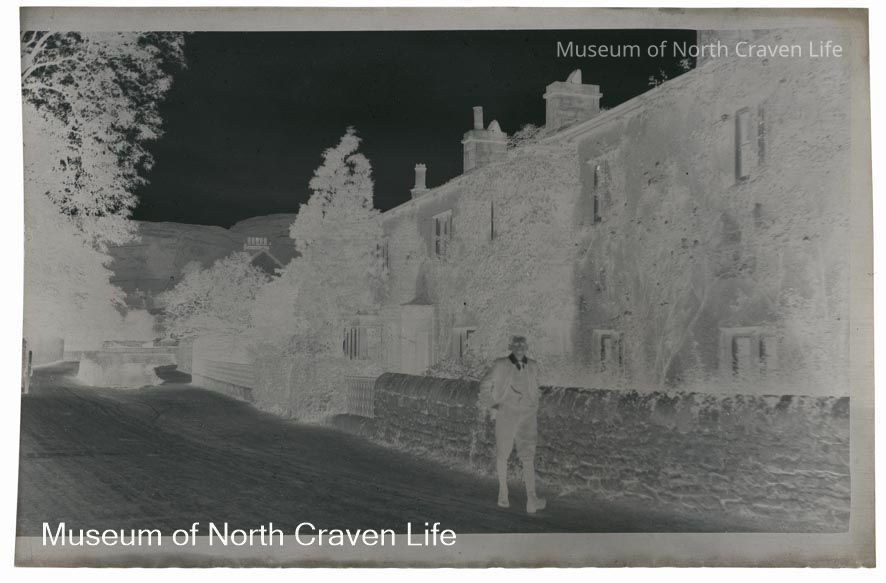 A nitrate film negative. A view of Tems Street in Giggleswick. A young man walks down the street beside a stone wallCollection