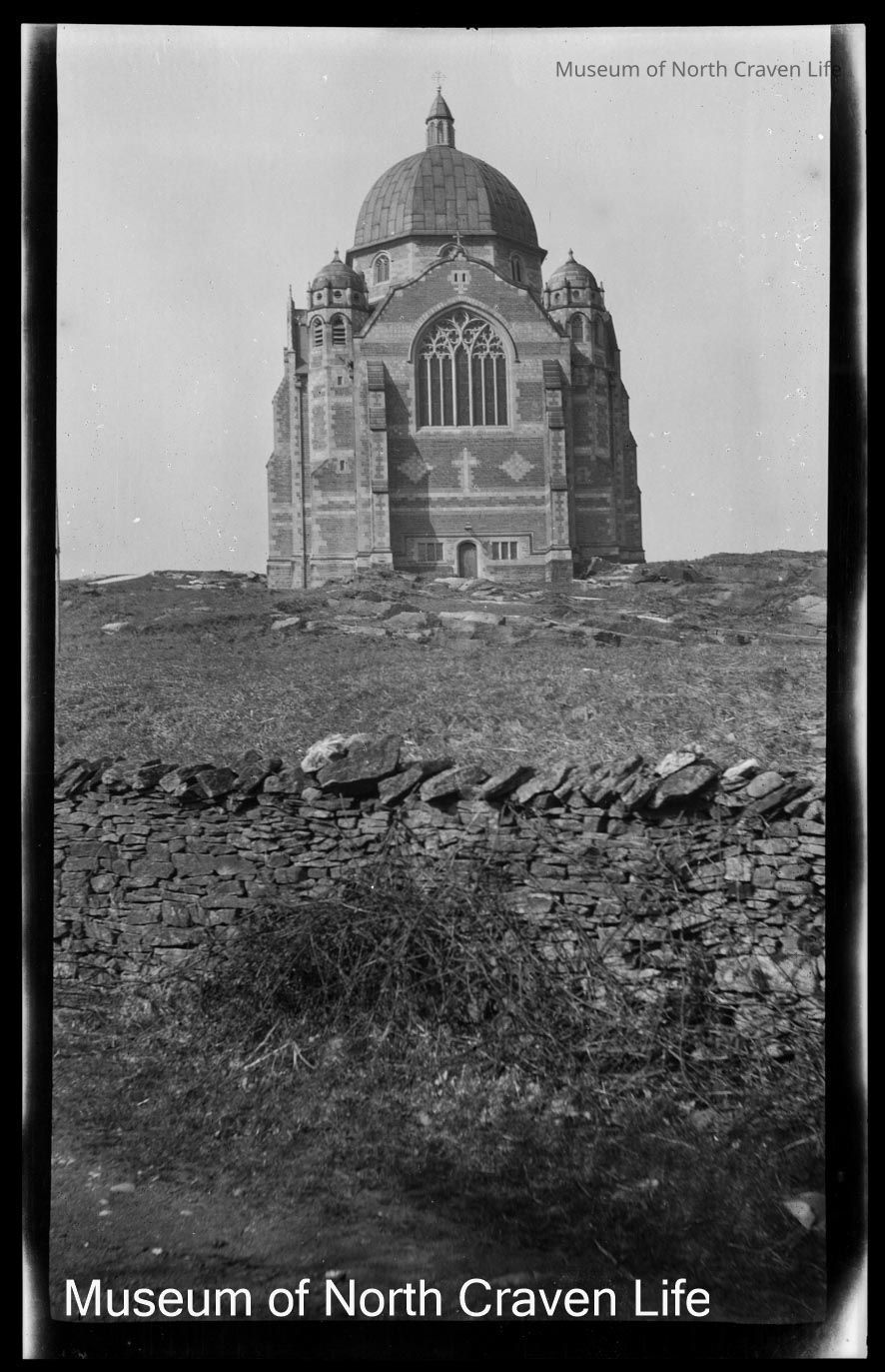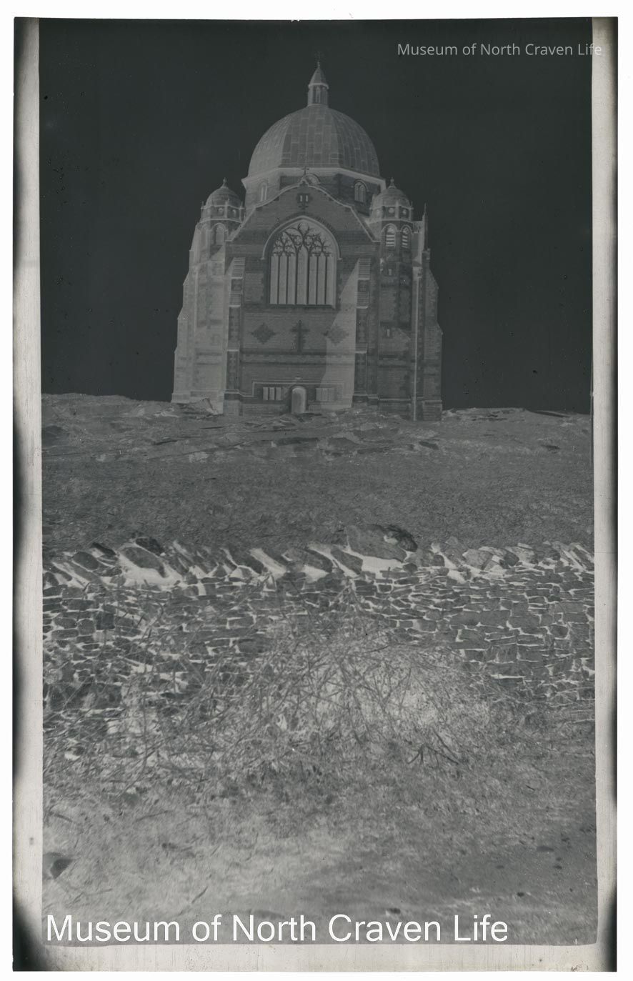 A nitrate film negative. A view of the exterior of Giggleswick School Chapel. A dry stone wall appears in the foregroundCollection
