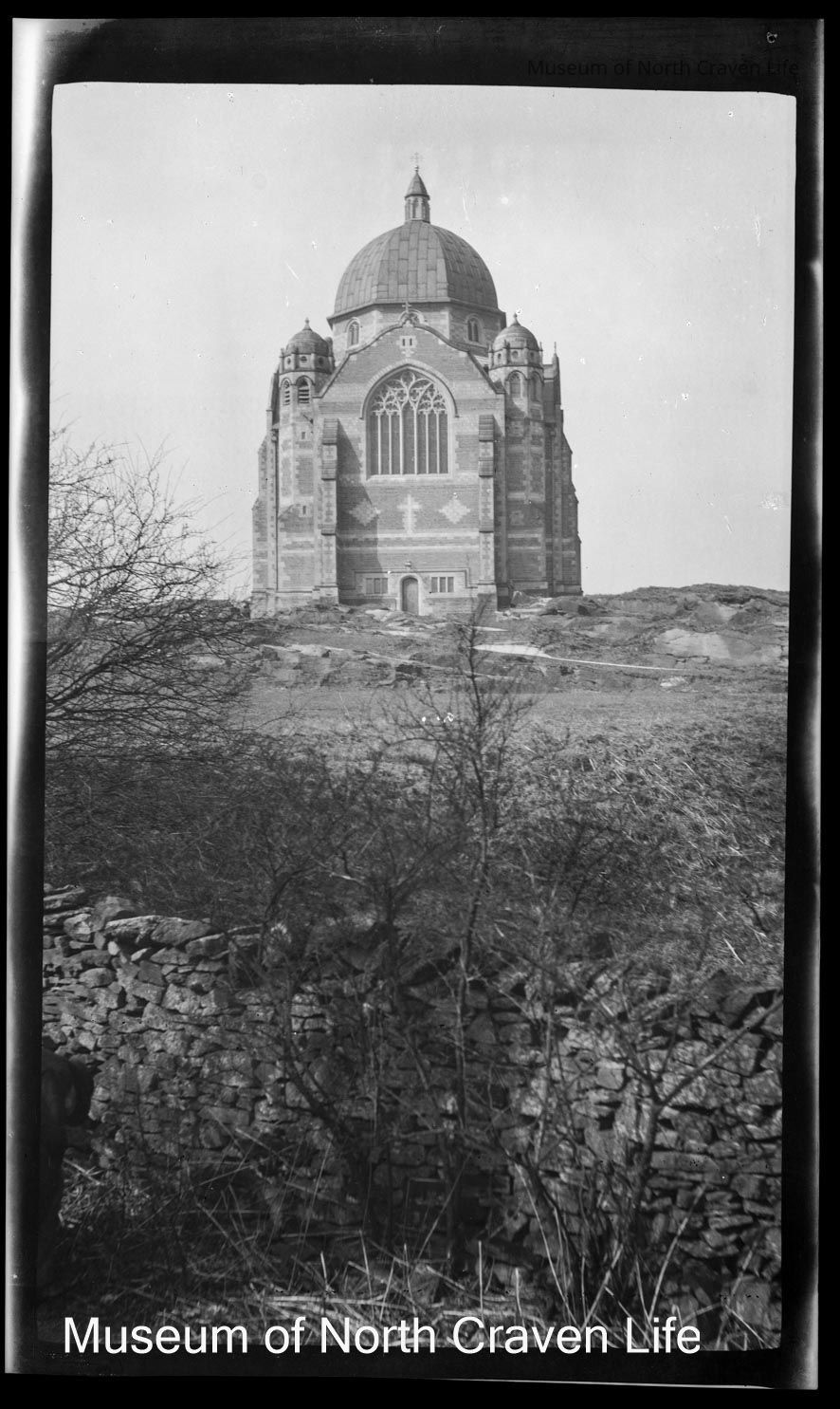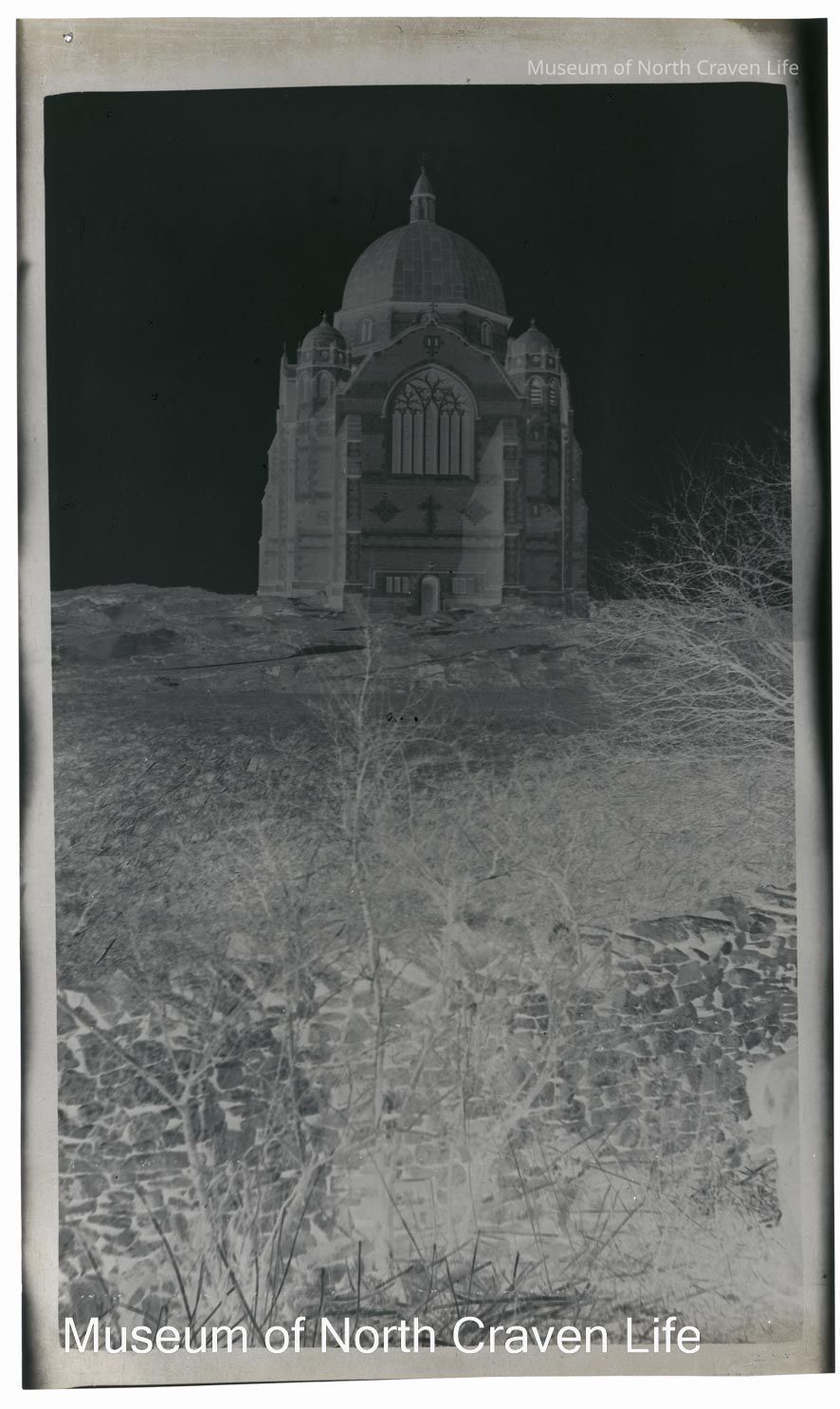 A nitrate film negative. A view of the exterior of Giggleswick School Chapel. A dry stone wall appears in the foregroundCollection