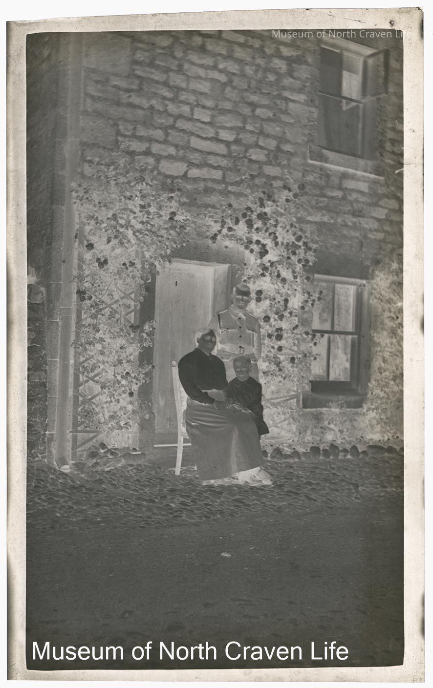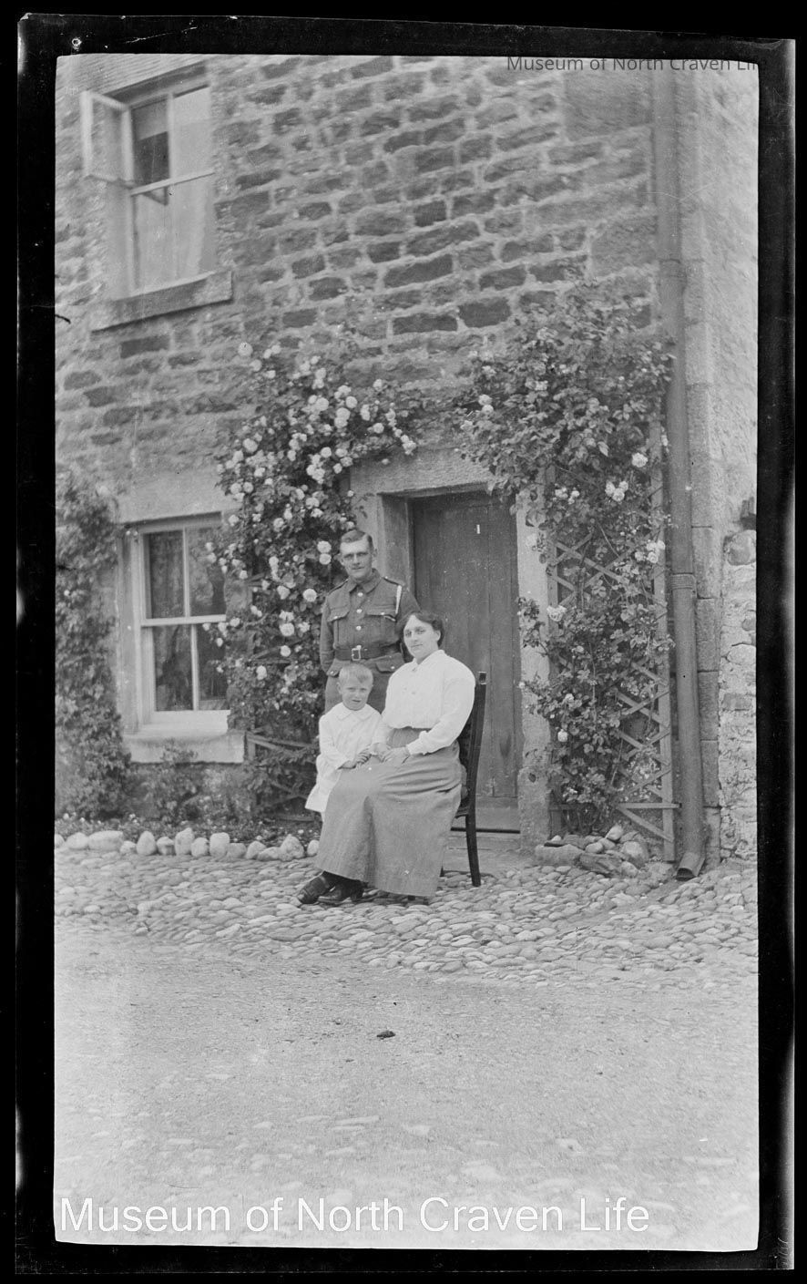 A gelatin silver film negative. A group portrait of a soldier in uniform standing behind a seated woman with young child. The group is placed outside on a cobbled surface in front of a doorCollection
