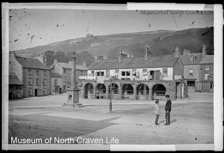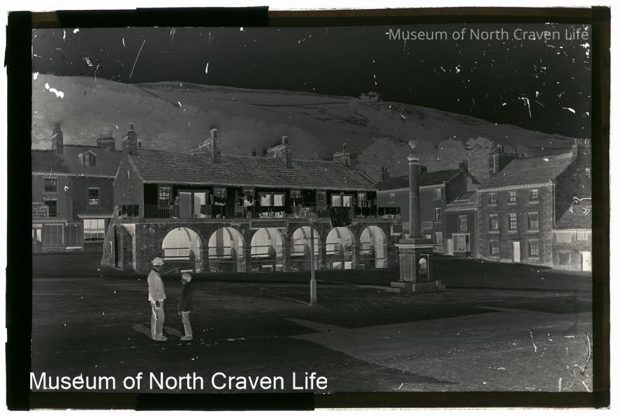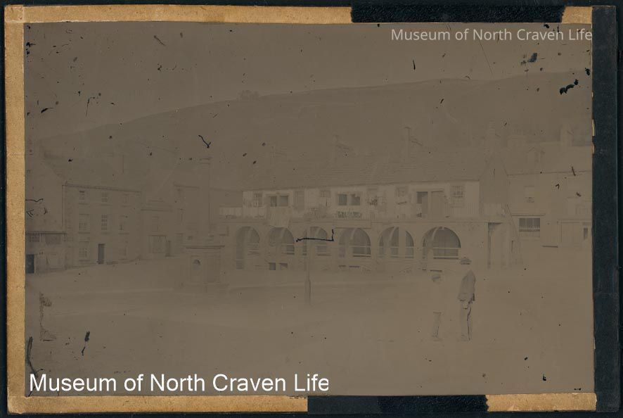 A half-plate wet collodion negative. A view of the Market Square and the Shambles (single story) in Settle. A man and a boy stand in the foregroundCollection