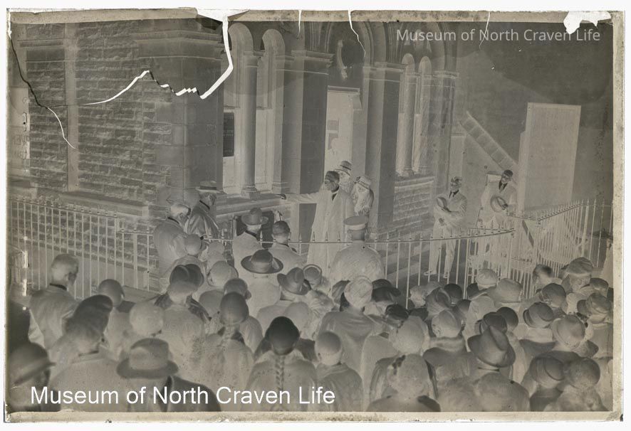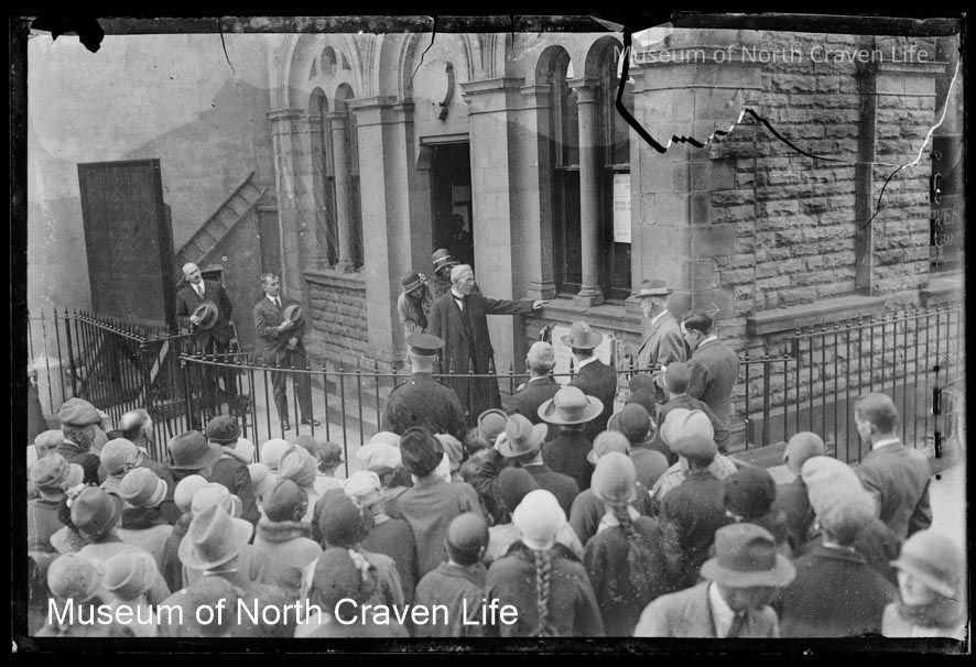 A half-plate gelatin silver glass negative. A view of the former Lloyds Bank in Settle at the unveiling ceremony for the memorial plaque to Benjamin Waugh. The plaque bears the following legend: "Site of birthplace of the Rev. Benjamin Waugh, founder of the Society for the Prevention of Cruelty to Children - born Feb 20, 1839, died March 11 1908 - The Children's Friend."Collection