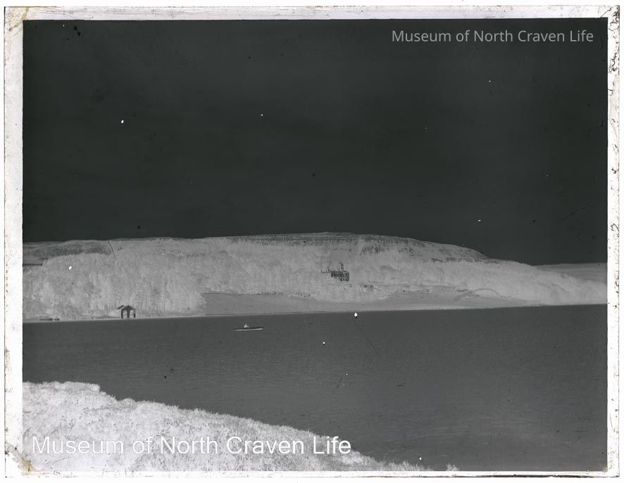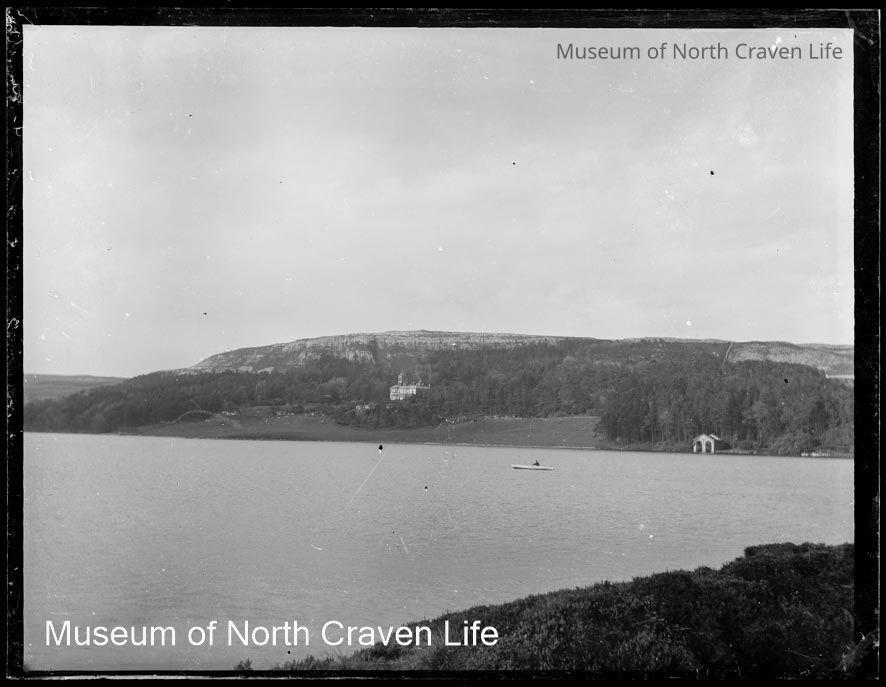 A full-plate gelatin silver glass negative. A view across Malham Tarn; Tarn House with its bell tower appears in the centre ground. A boat with a man rowing is on the lake. The boat house is located on the rightCollection