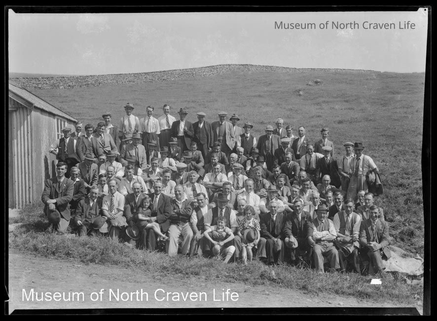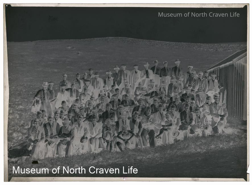 A half-plate gelatin silver film negative. A group portrait of Bridlington farmers seated and standing in the open beside a corrugated iron shedCollection