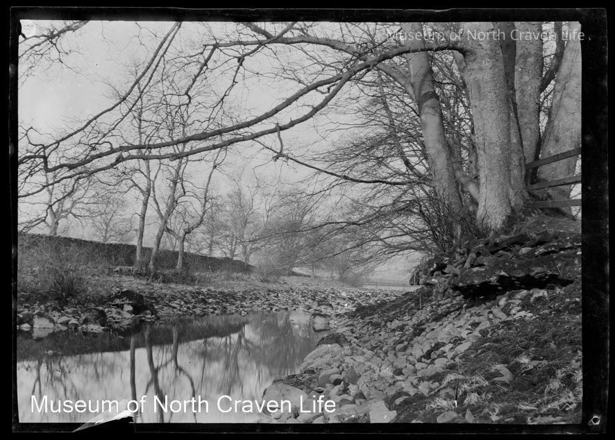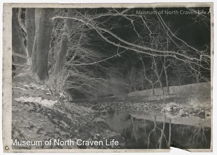 A gelatin silver film negative. A river view at very low water in winter, with a large multi-stemmed sycamore tree to right of frame and a distant view of a timber bridge.Collection