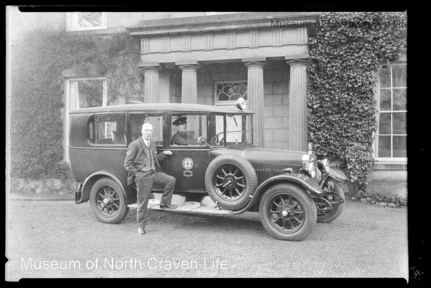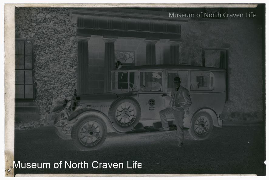 A gelatin silver nitrate film negative. Settle & District Ambulance with uniformed driver at the wheel and a man with his foot on the running board. Filed with enveloped upon which appears the text : 'Billon? Motor Ambulances Box 26'Collection