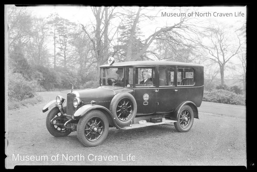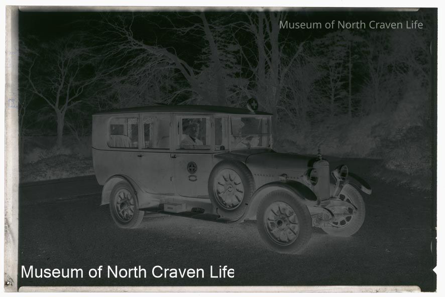 A gelatin silver nitrate film negative. Settle & District Ambulance with uniformed driver at the wheel and male passenger.Collection