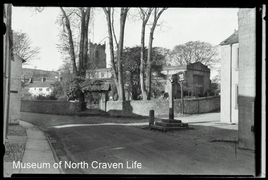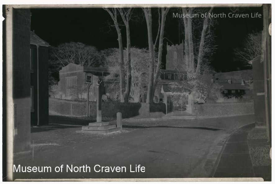 A gelatin silver film negative. A view of the Church of St Alkelda, Giggleswick with the Market Cross in the foreground.Collection