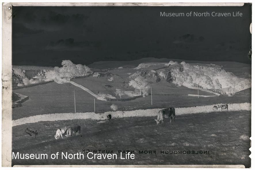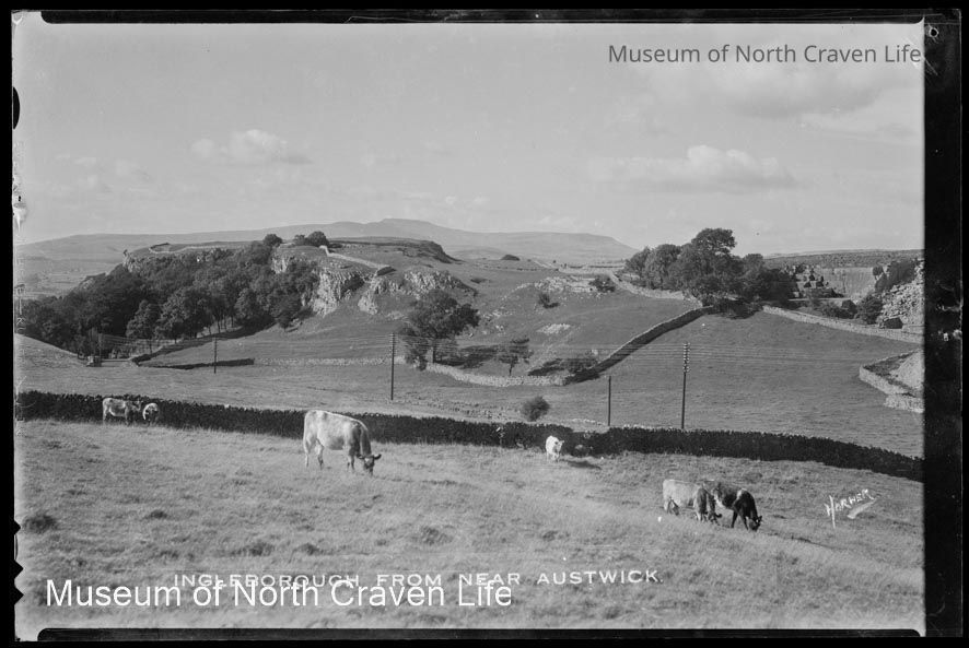 A gelatin silver film negative. A view of Ingleborough across the fields from Austwick. Cattle graze in the foregroundCollection