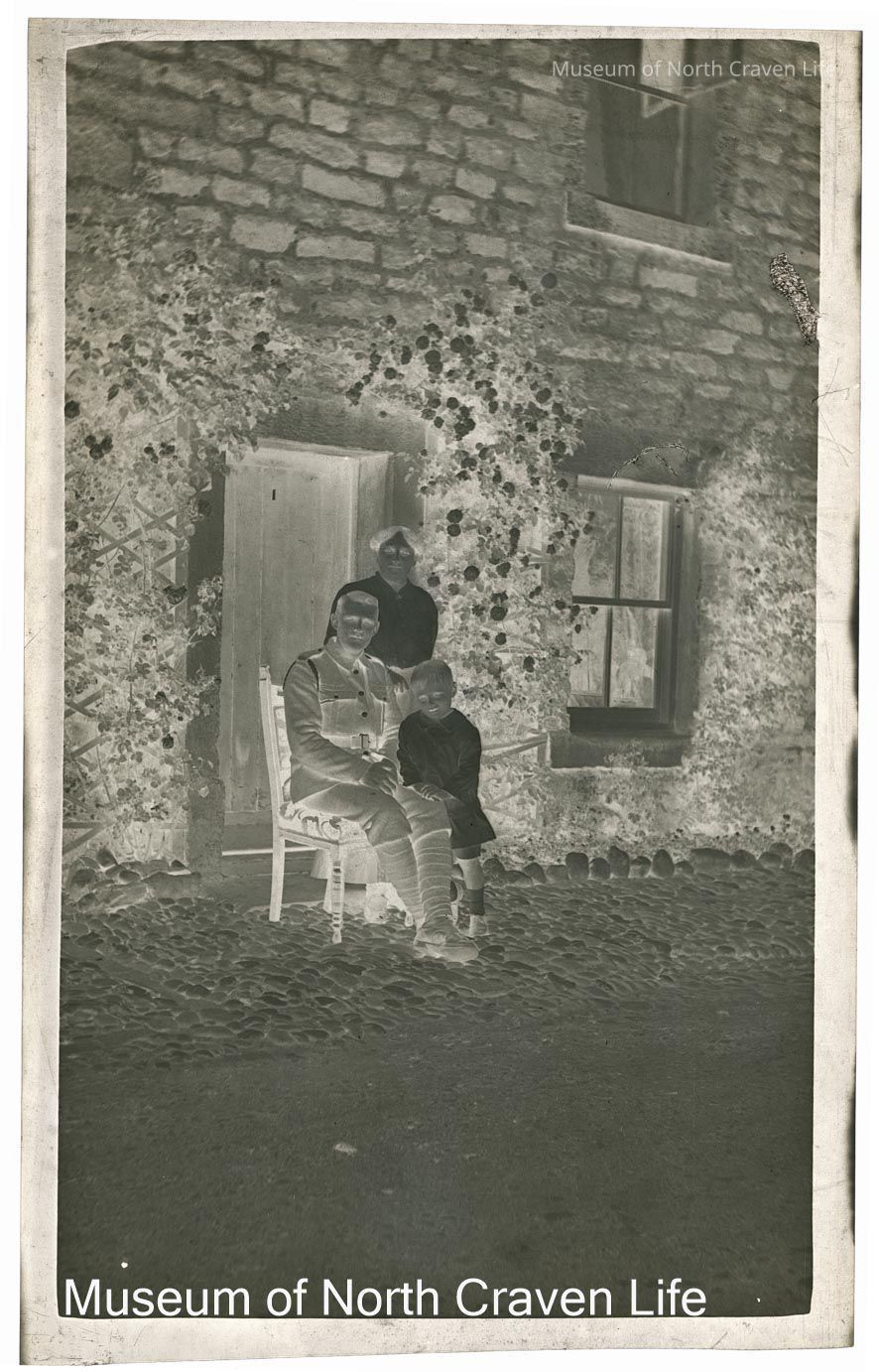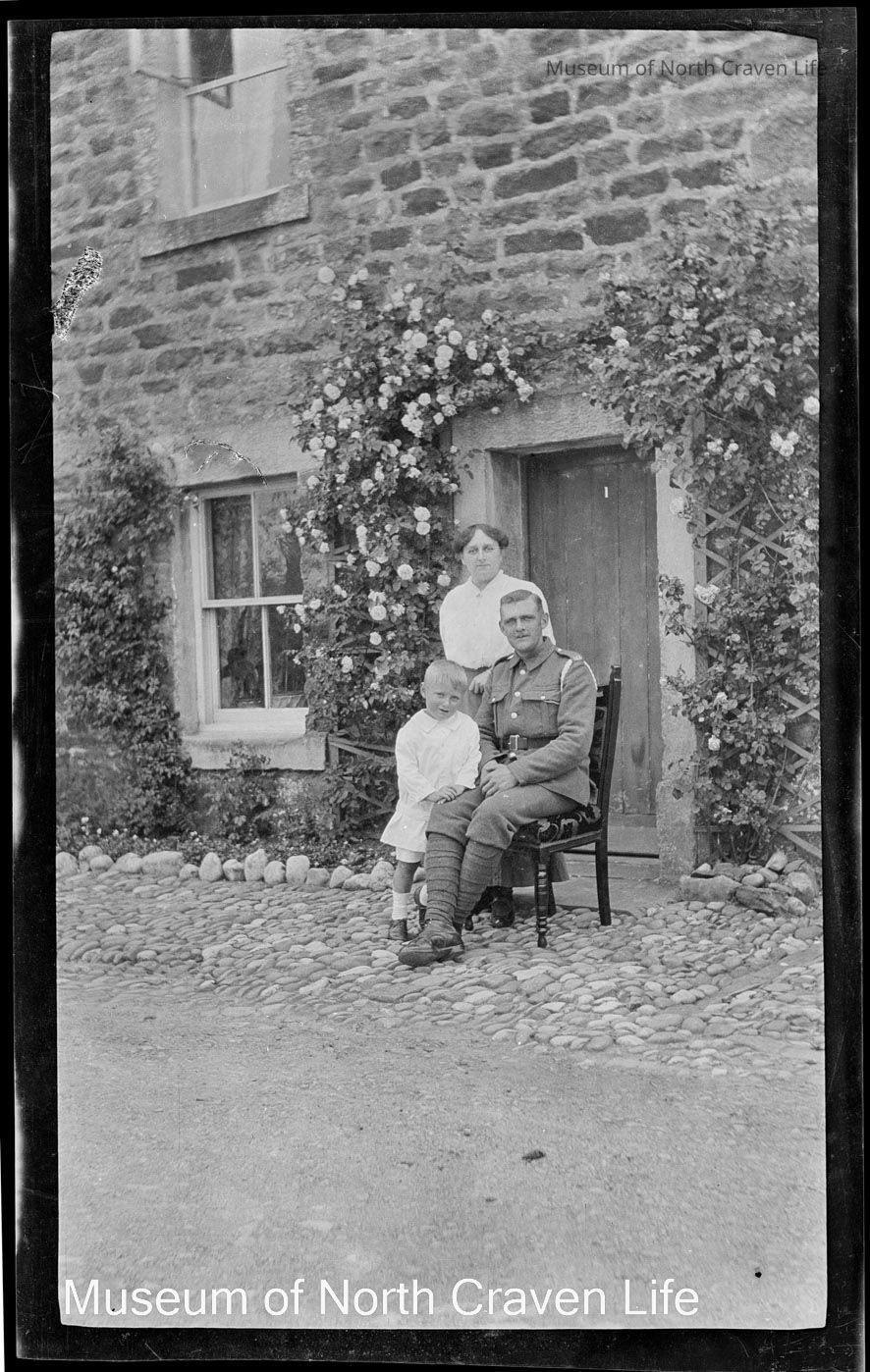 A gelatin silver nitrate film negative. A group portrait of a uniformed British soldier (seated), with a woman and child, outside the door of a cottageCollection