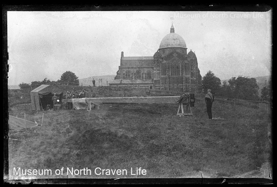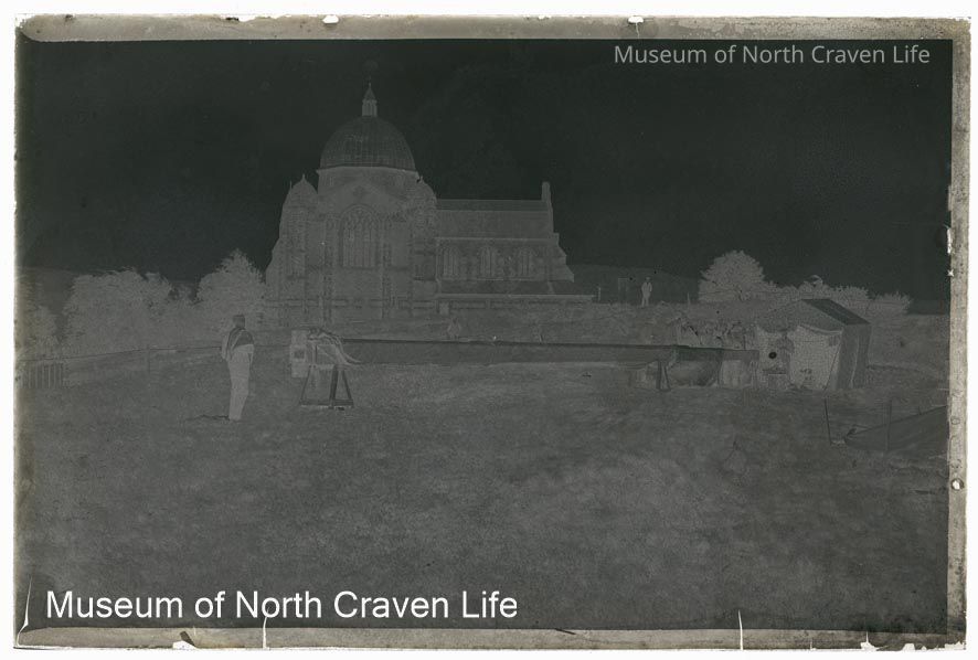 A half-plate gelatin silver glass negative. A view of a group of people standing in a field watching the eclipse through a light box. Giggleswick School Chapel appears in the backgroundCollection