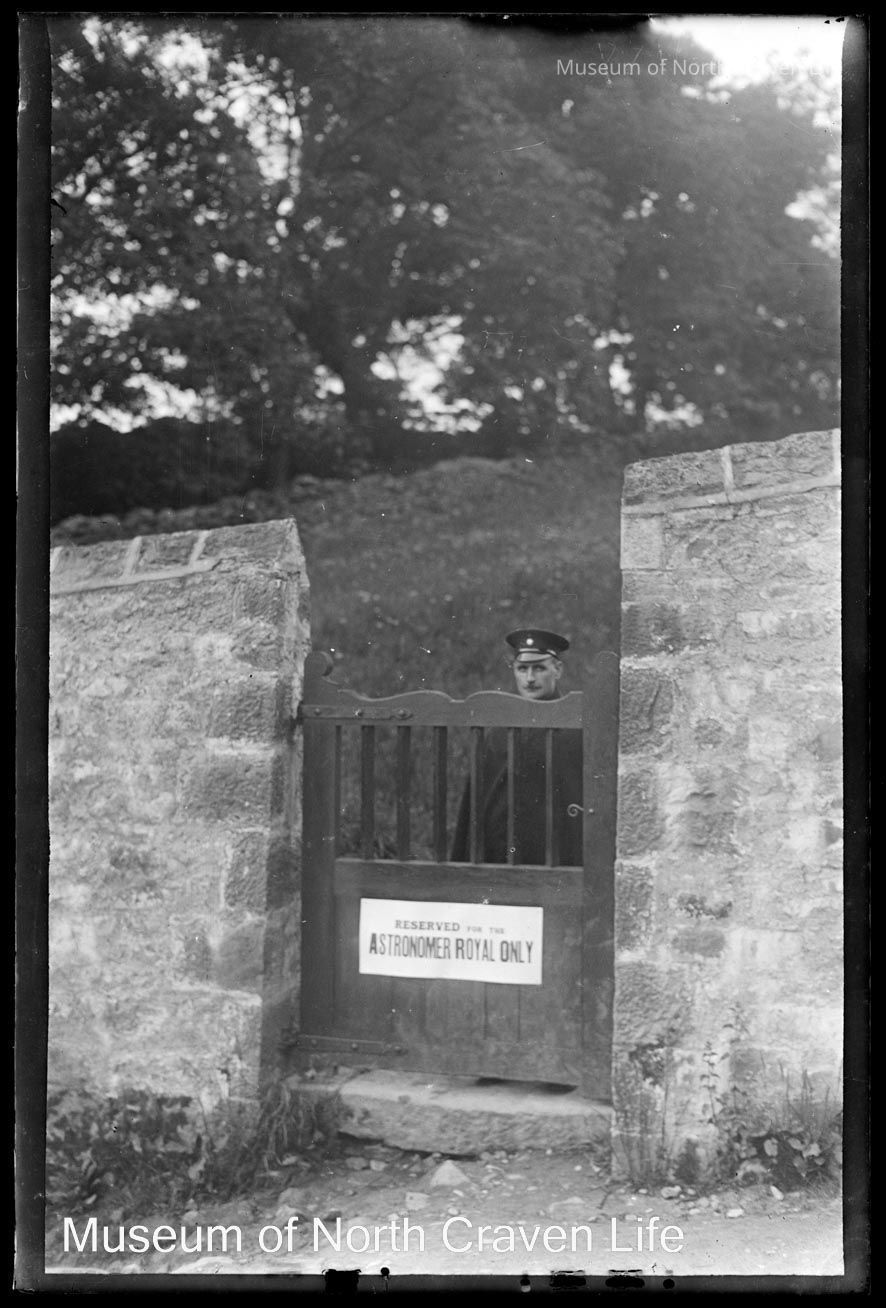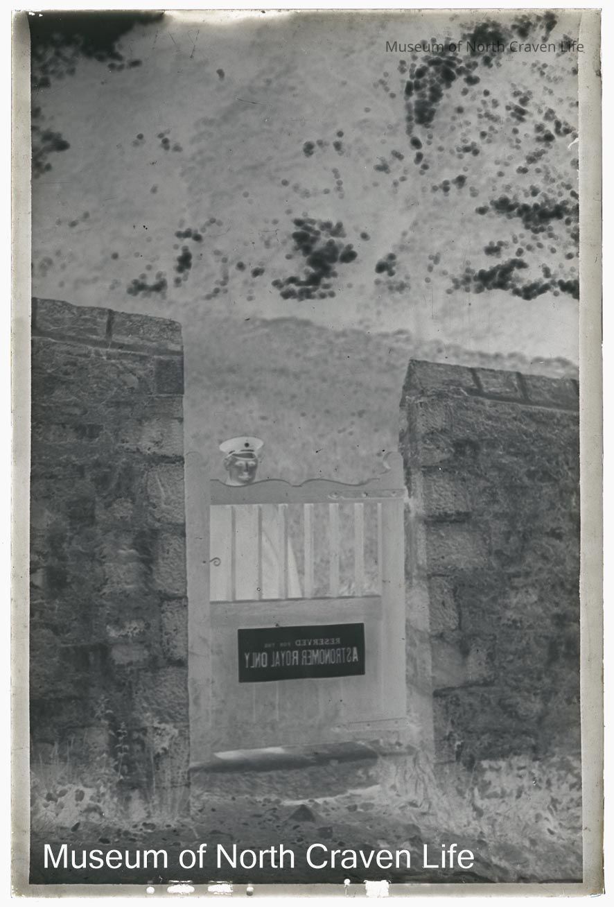 A half-plate gelatin silver glass negative. A view of a gate in a wall bearing the sign: 'RESERVED FOR THE ASTRONOMER ROYAL ONLY'. A uniformed policeman? stands behind the gateCollection
