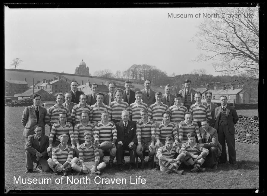 A half-plate gelatin silver film negative. A portrait of North Ribblesdale Rugby Union Football Club 1st, 2nd XV April 1949. The players are seated and standing in a field flanked by a stone wall. Giggleswick School Chapel appears on the skylineCollection