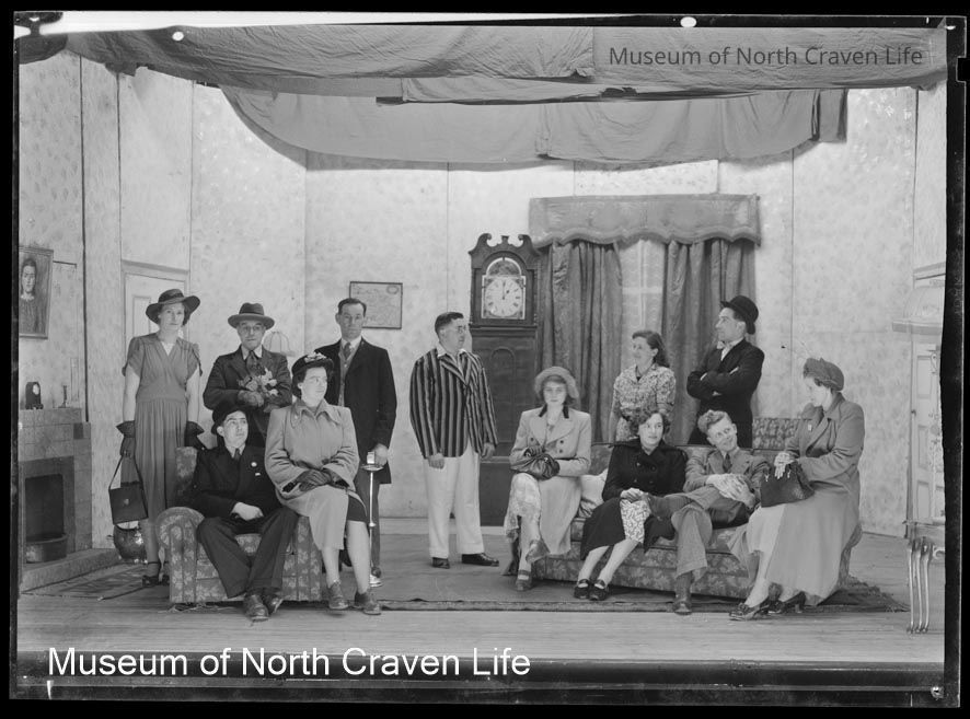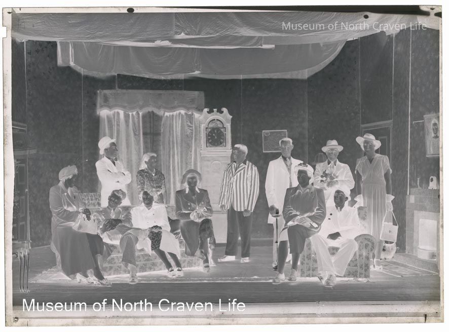 A half-plate gelatin silver film negative. A view of a stage upon which are standing and seated groups of men and women in costumeCollection