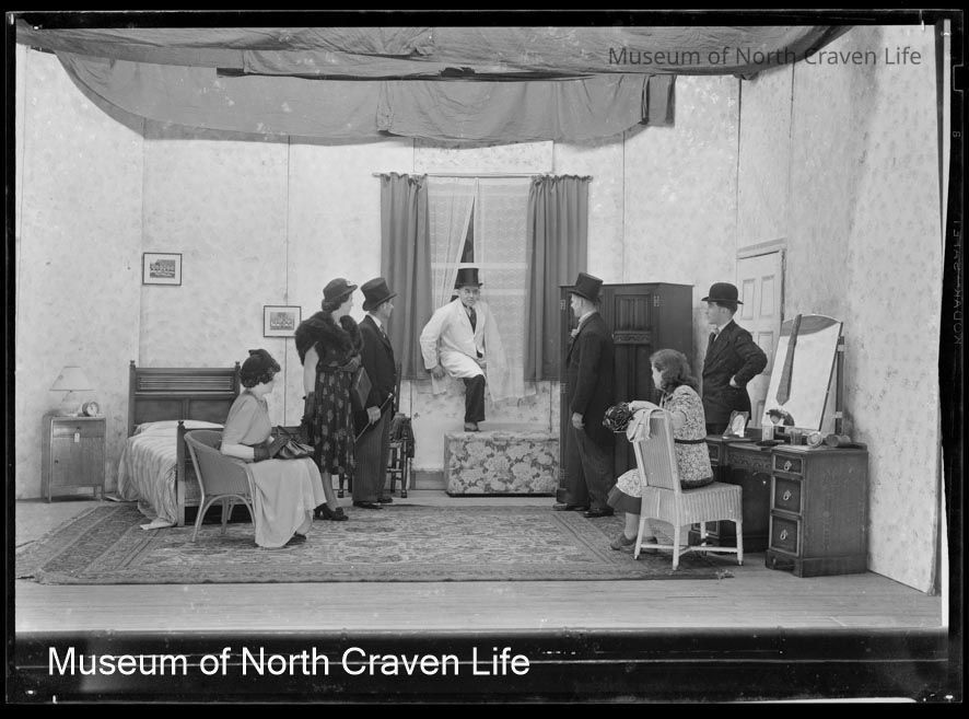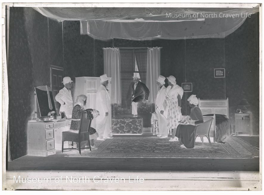 A half-plate gelatin silver film negative. A view of a stage upon which are standing and seated groups of men and women in costumeCollection
