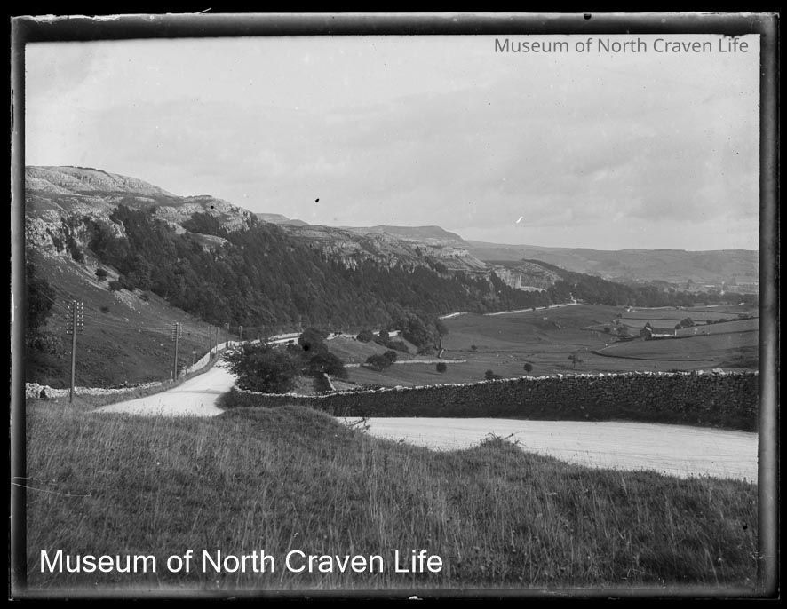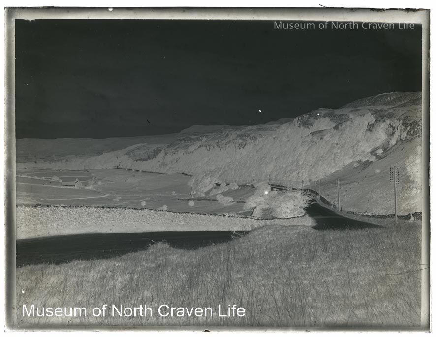 A quarter plate gelatin silver glass negative. A view of Giggleswick Scar from the road which is bordered by a stone wallCollection