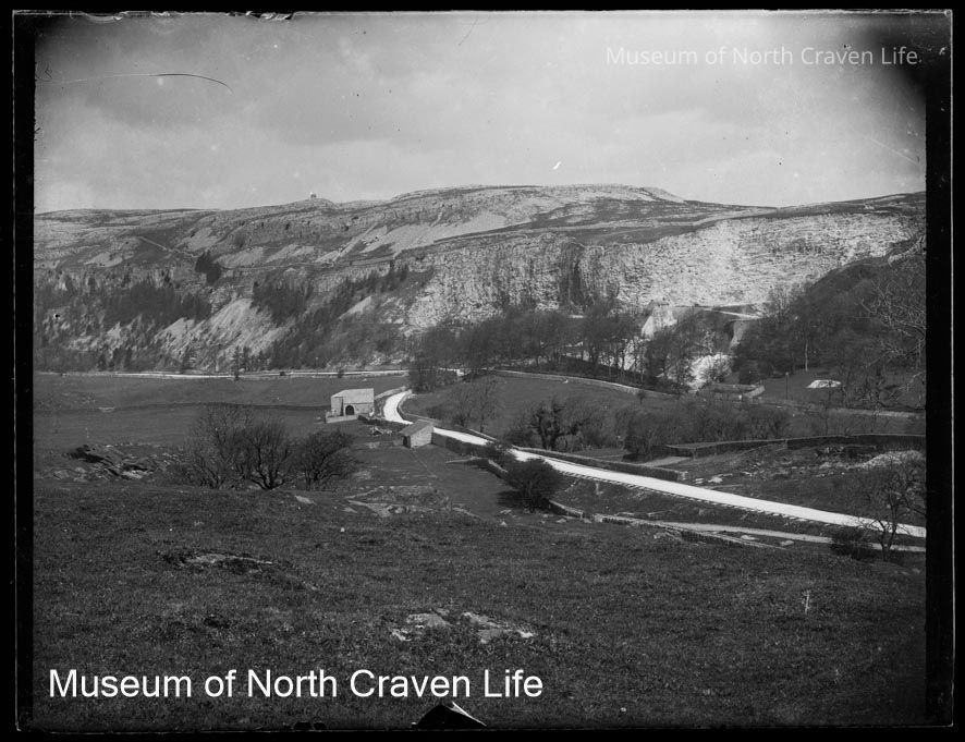 A quarter plate gelatin silver glass negative. A view of Giggleswick Scar from the road which is bordered by a stone wall. In the mid-distance appear a stone barn and a second smaller stone structureCollection