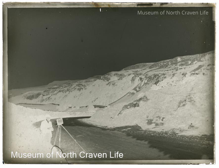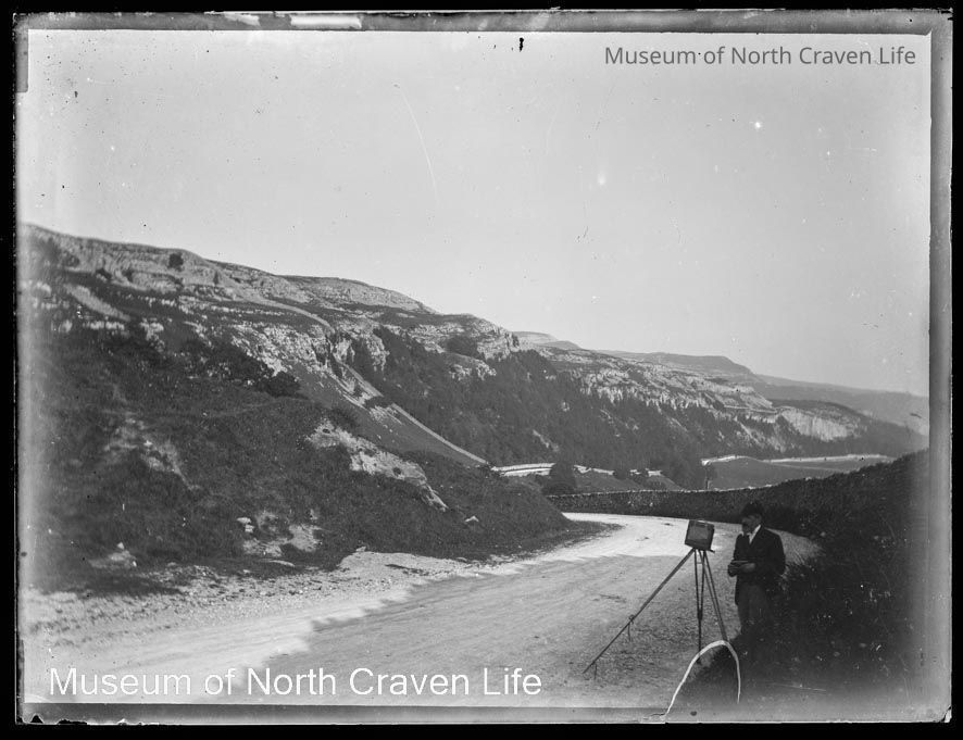 A quarter plate gelatin silver glass negative. A view of Giggleswick Scar from the road which is bordered by a stone wall. A man stands on the road in the right foreground with a camera mounted on a tripodCollection