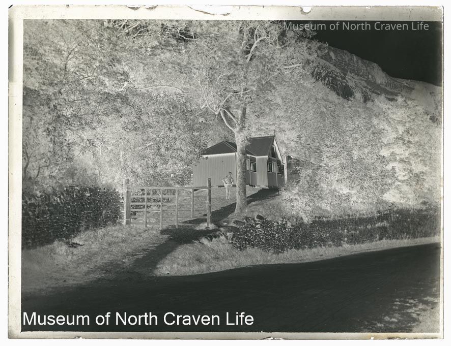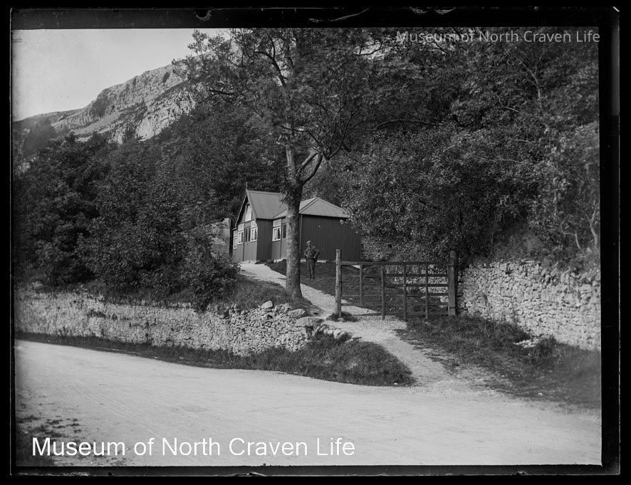 A quarter plate gelatin silver glass negative. The wooden golf house is located on a slope above the road. A man stands in front of it on a track closed by a wooden barred gate. Giggleswick Scar rises up through the trees in the backgroundCollection