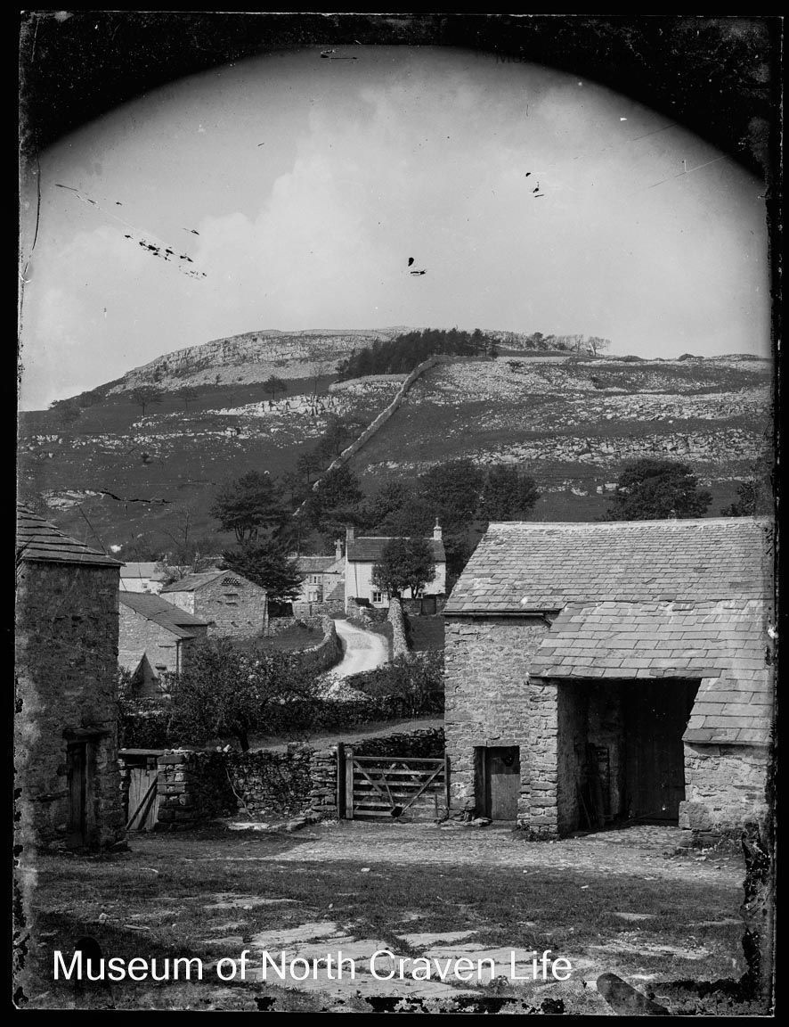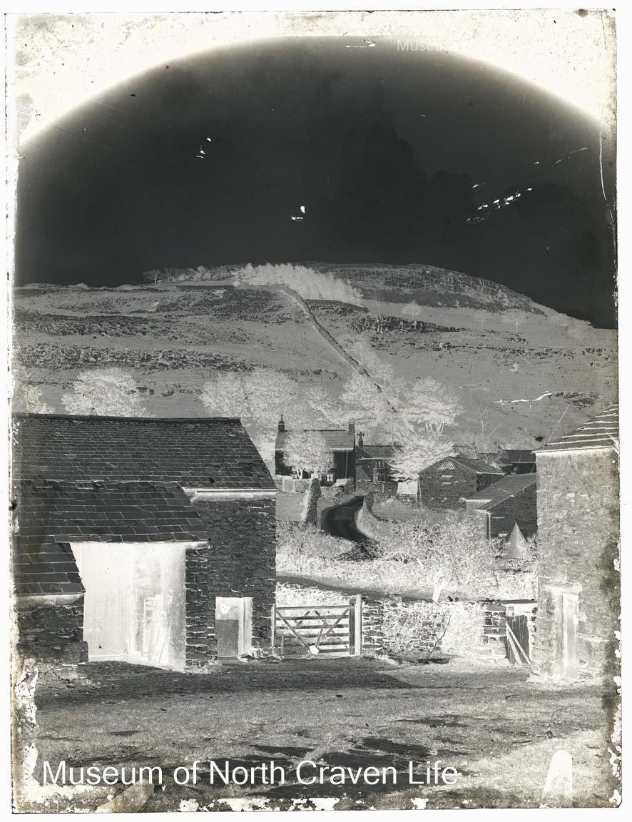 A quarter plate gelatin silver glass negative. A view of Feizor across a farmyard. A barn stands in the foreground ; the village stretches away in the background, framed by a fellCollection