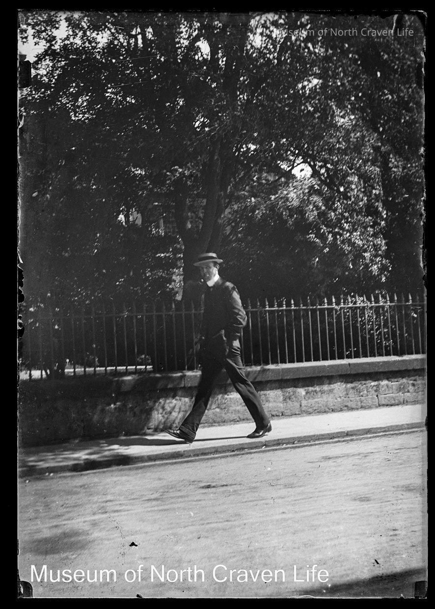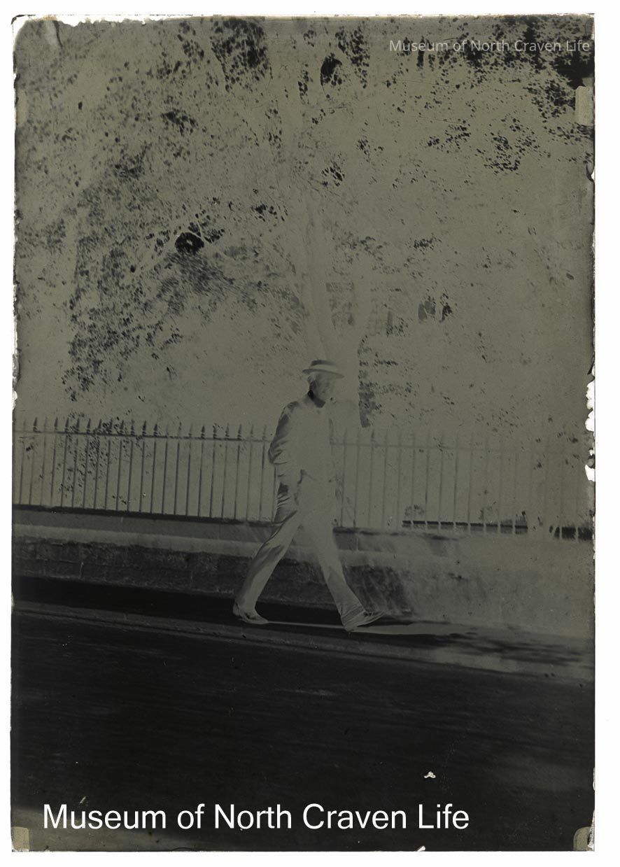 A quarter plate gelatin silver glass negative. A portrait of a man in a suit and wearing a hat, walking along a steet beside a low wall with an iron railingCollection