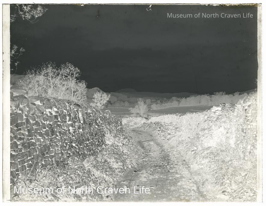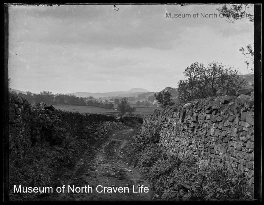 A quarter plate gelatin silver glass negative. A view of Settle across the fields. A walled lane appears in the foregroundCollection